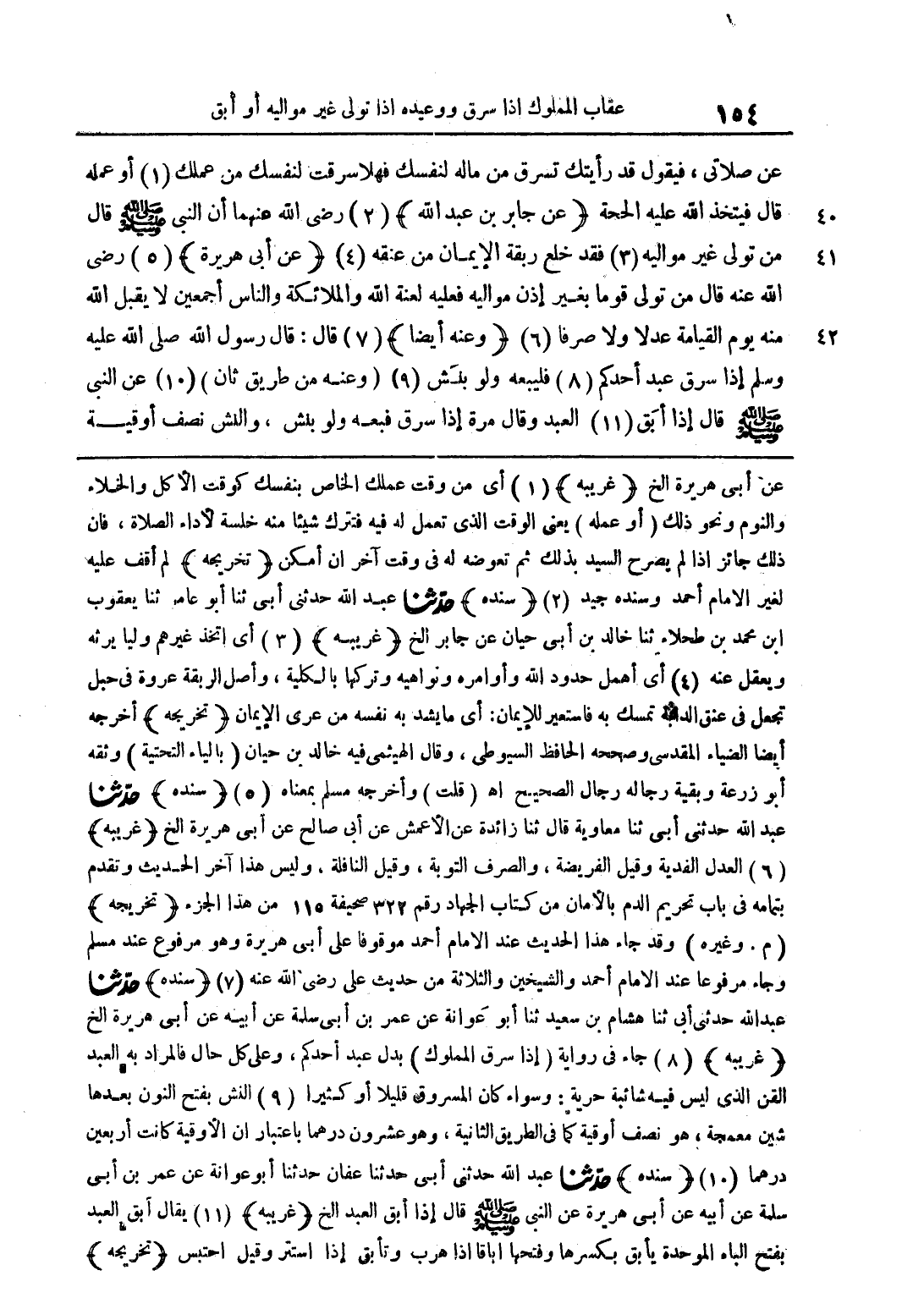 عن صلاتي، فيقول قد رأيتك تسرق من ماله لنفسك فهلا سرقت لنفسك من عملك أو عمله قال فيتخذ اللع عليه الحجة (عن جابر بن عبد الله) رضي الله عنهما أن النبي صلى الله عليه وسلم قال من تولى غير مواليه فقد خلع ربقة الإيمان من عنقه (عن أبي هريرة) رضي الله عنه قال من تولى قوما بغير إذن مواليه فعليه لعنة الله والملائكة والناس أجمعين لا يقبل الله منه يوم القيامة عدلا ولا صرفا (وعنه أيضا) قال: قال رسول الله صلى الله عليه وسلم إذا سرق عبد أحدكم فليبعه ولو بنش (وعنه من طريق ثان) عن النبي صلى الله عليه وسلم قال إذا أبق العبد والمرة إذا سرق فبعه ولو بنش، والنش نصف أوقية