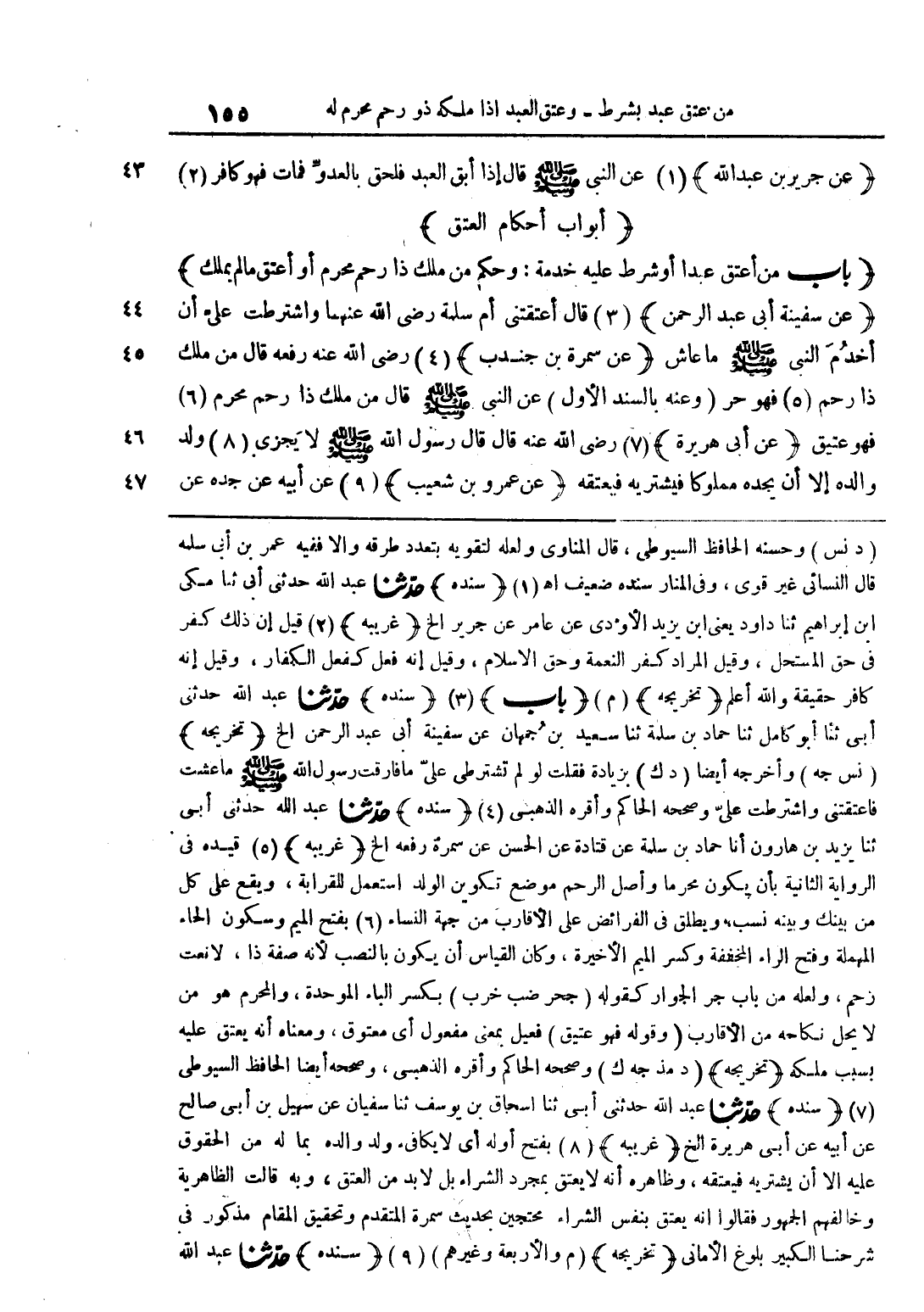 (باب من أعتق عبدا أزو شرط عليه خدمة: وحكم من ملك ذا رحم محرم أو أعتق ما لم يملك) (عن سفينة أبي عبد الرحمن) قال أعتقني أم سلمة رضي الله عنهما واشترطت على أن أخدم النبي صلى الله عليه وسلم ما عاش (عن سمرة بن جندب) رضي الله عنه رفعه قال من ملك ذا رحم فهو حر (وعنه بالسند الأول) عن النبي صلى الله عليه وسلم قال من ملك ذا رحم محرم فهو عتيق (عن أبي هريرة) رضي الله عنه قال: قال رسول الله صلى الله عليه وسلم لا يجزي ولد والده إلا أن يجده مملوكا فيشتريه فيعتقه (عن عمرو بن شعيب) عن أبيه عن جده عن
