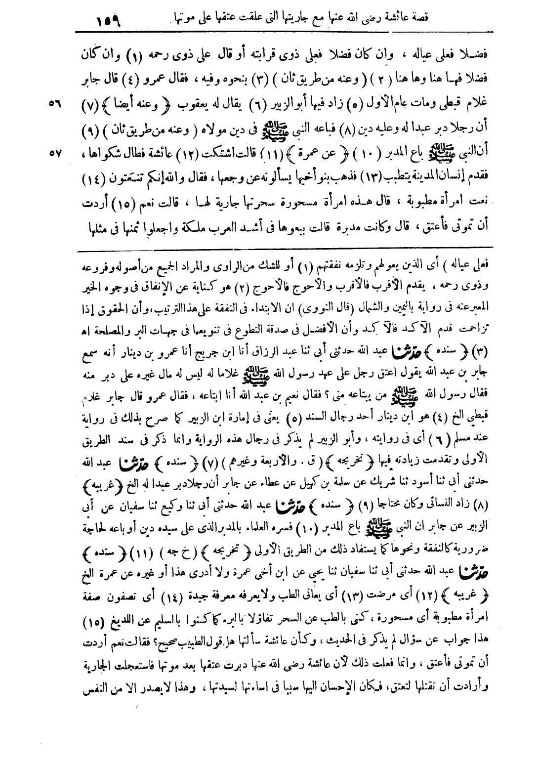 فعلى عياله) أي الذين يعولوهم وتلزمه نفقتهم أو للشك من الراوي والمراد الجميع من أصوله وفروعه وذوي رحمه، يقدم الأقرب فالأقرب والأحوج هو كناية عن الإنفاق في وجوه الخير المعبر عنه في رواية باليمين والشمال (قال النووي) إن الابتداء في النفقة على هذا الترتيب، وأن الحقوق إذا تزاحمت قدم الآكد فالآكد وأن الأفضل في صدقة التطوع في تنويعها في جهات البر والمصلحة اهـ (سنده) حدثنا عبد الله حدثني أبي ثنا عبد الرزاق أنا ابن جرير أنا عمرو بن دينار أنه سمع جابر بن عبد الله يقول اعتق رجل على عهد رسول الله صلى الله عليه وسلم غلاما له ليس له مال غيره على دبر منه فقال رسول الله صلى الله عليه وسلم من يبتاعه مني؟ فقال نعيم بن عبد الله أنا أبتاعه، فقال عمرو قال جابر غلام قبطي الخ هو ابن دينار أحد رجال السند يعني في إمارة ابن الزبير كما صرح بذلك في رواية عند مسلم أي في روايته، وأبو الزبير لم يذكر في رجال هذه الرواية وإنما ذكر في سند الطريق الأولى وتقدمت زيادته فيها (تخريجه) (ق. والأربعة وغيرهم) (سنده) حدثنا عبد الله حدثني أبي ثنا أسود ثنا شريك عن سلمة بن كهيل عن عطاء عن جابر أن رجلا دبر عبد الله الخ (غريبة) زاد النسائي وكان محتاجا (سنده) حدثنا عبد الله حدثني أبي ثنا وكيع ثنا سفيان عن أبي الزبير عن جابر أن النبي صلى الله عليه وسلم باع المدبر فسره العلماء بالمدبر الذي على سيده دين أو باعه لحاجة ضرورية كالنفقة ونحوها كما يستفاد ذلك من الطريق الأولى (تخريجه) (خ جه) (سنده) حدثنا عبد الله حدثني أبي ثنا سفيان ثنا يحيى عن ابن أخي عمرة ولا أدري هذا أو غيره عن عمرة الخ (غريبة) أي مرضت أي يعاني الطب ولا يعرفه معرفة جيدة أي تصفوه صفة امرأة مطبوبة أي مسحورة، كني بالطب عن السحر تفاؤلا بالبر كما كنوا بالسليم عن اللديغ هذا جواب عن سؤال لم يذكر في الحديث، وكأن عائشة سألتها هل قول الطبيب صحيح؟ فقالت نعم أردت أن تموتي فأعتق، وإنما فعلت ذلك لأن عائشة رضي الله عنها دبرت عتقها بعد موتها فاستعجلت الجارية وأرادت أن تقتلها لتعتق، فكان الإحسان إليها سببا في إساءتها لسيدتها، وهذا لا يصدر إلا من النفس