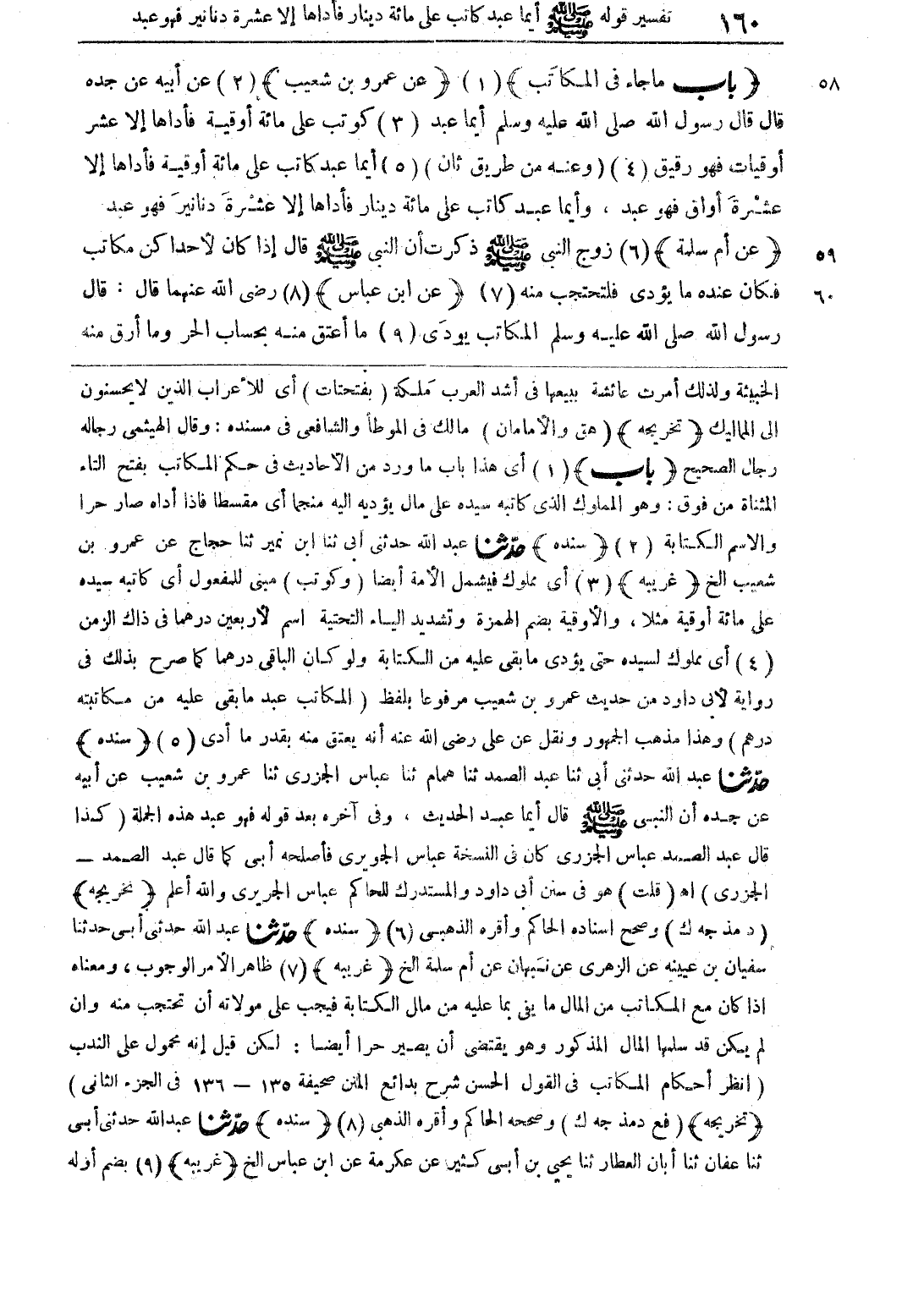 الخبيثة ولذلك أمرت عائشة بيعها في أشد العرب ملكة (بفتحات) أي للأعراب الذين لا يحسنون إلى المماليك (تخريجه) (هق والأمامان) مالك في الموطأ والشافعي في مسنده: وقال الهيثمي رجاله رجال الصحيح (باب) أي هذا باب ما ورد من الأحاديث في حكم المكاتب بفتح التاء المثناة من فوق: وهو المملوك الذي كاتبه سيده على مال يؤديه إليه منجما أي مقسطا فإذا صار حرا والاسم الكتابة (سنده) حدثنا عبد الله حدثني أبي ثنا ابن نمير ثنا حجاج عن عمرو بن شعيب الخ (غريبة) أي مملوك فيشمل الأمة أيضا (وكوتب) مبنى للمفعول أي كاتبه سيده على مائة أوقية مثلا، والأوقية الهمزة بضم الهمزة وتشديد الياء التحتية اسم لأربعين درهما في ذلك الزمن أي مملوك لسيده حتى يؤدي ما بقي عليه من الكتابة ولو كان الباقي درهما كما صرح بذلك رواية لأبي داود من حديث عمرو بن شعيب مرفوعا بلفظ (المكاتب عبد ما بقي عليه من مكاتبته درهم) وهذا مذهب الجمهور ونقل عن علي رضي الله عنه أنه يعتق منه بقدر ما أدى (سنده) حدثنا عبد الله حدثني أبي ثنا عبد الصمد ثنا همام ثنا عباس الجزري ثنا عمرو بن شعيب عن أبيه عن جده أن النبي صلى الله عليه وسلم قال أيما عبد الحديث، وفي آخره بعد قوله فهو عبد هذه الجملة (كذا قال عبد الصمد عباس الجزري كان في النسخة عباس الجويري فأصلحه أبي كما قال عبد الصمد الجزري) اهـ (قلت) هو في سنن أبي داود والمستدرك للحاكم عباس الجريري والله أعلم (تخريجه) (د مذ جه ك) وصحح إسناده الحاكم وأقره الذهبي (سنده) حدثنا سفيان بن عيينه عن الزهري عن نسبهان عن أم سلمة الخ (غريبة) ظاهر الأمر الوجوب، معناه إذا كان معه المكاتب من المال ما في بما عليه من مال الكتابة فيجب على مولاته أن تحتجب منه وإن لم يكن قد سلمها المال المذكور وهو يقتضي أن يصير حرا أيضا: لكن قيل إنه محمول على الندب (انظر أحكام المكاتب في القول الحسن شرح بدائع المنن صحيفة 135 - 136 في الجزء الثاني) (تخريجه) (فع د مذ جه ك) وصححه الحاكم وأقره الذهبي (سنده) حدثنا عبد الله حدثني أبي ثنا عفان ثنا أبان العطار ثنا يحيى بن أبي كثير عن عكرمة عن ابن عباس الخ (غريبة) بضم أوله
