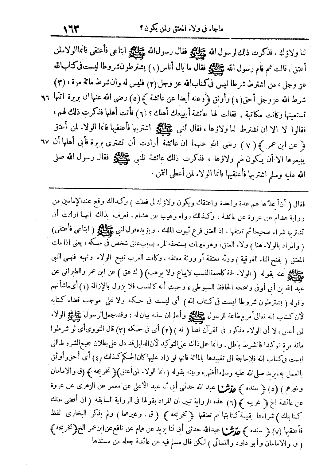 لنا ولاؤك، فذكرت ذلك لرسول الله صلى الله عليه وسلم فقال رسول الله صلى الله عليه وسلم إبتاعي فأعتقني فإنما الولاء لمن أعتق، قالت ثم قام رسول الله صلى الله عليه وسلم فقال ما بال أناس يشترطون شروطا ليست في كتاب الله عز وجل، من اشترط شرطا ليس في كتاب الله عز وجل فليس له وأن شرط مائة مرة، شرط الله عز وجل أحق وأوثق (وعنه أيضا عن عائشة) رضي الله عنها أن بريرة أتتها تستعينها وكانت مكاتبة، فقالت لها عائشة أيبيعك أهلك؟ فأتت أهلها فذكرت ذلك لهم، فقالوا لا إلا أن تشترط لنا ولاؤها، فقال النبي صلى الله عليه وسلم اشتريها فأعتقيها فإنما الولاء لمن أعتق (عن ابن عمر) رضي الله عنهما أن عائشة أرادت أن تشتري بريرة فأبى أهلها أن يبيعوها إلا أن يكون لهم ولاءها، فذكرت ذلك عائشة للنبي صلى الله عليه وسلم فقال رسول الله صلى الله عليه وسلم اشتريها فأعتقيها فإنما الولاء لمن أعطى الثمن.