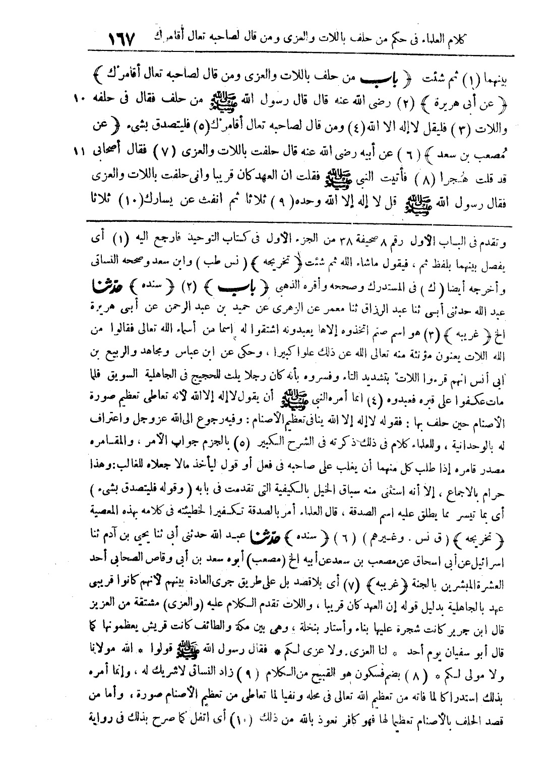 بينهما ثم شئت (باب من حلف باللات والعزى ومن قال لصاحبه تعال أقامرك) (عن أبي هريرة) رضي الله عنه قال: قال رسول الله صلى الله عليه وسلم من حلف فقال في حلفه واللات فليقل لا إله إلا الله ومن قال لصاحبه تعال أقامرك فليتصدق بشيء (عن مصعب بن سعد) عن أبيه رضي الله عنه قال حلفت باللات والعزى فقال أصحابي قد قلت هجرا فأتيت النبي صلى الله عليه وسلم فقلت إن العهد كان قريبا وإني حلفت باللات والعزى فقال رسول الله صلى الله عليه وسلم قال لا إله إلا الله وحده ثلاثا ثم انفث عن يسارك ثلاثا