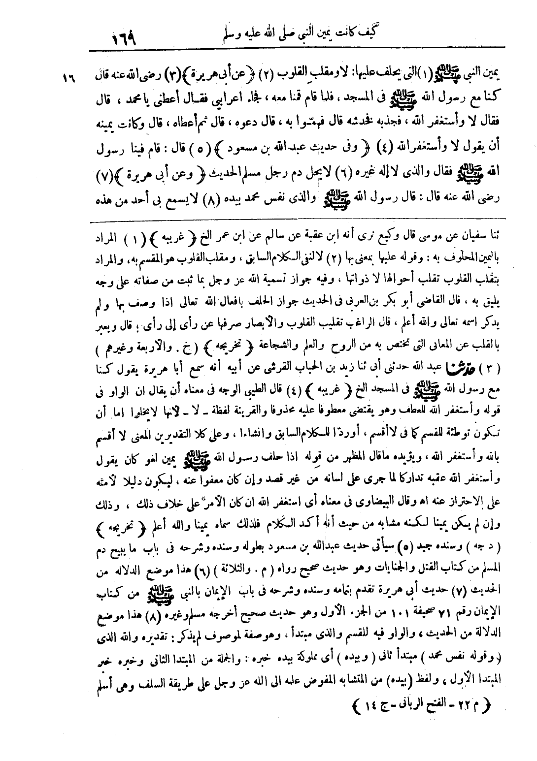 يمين النبي صلى الله عليه وسلم التي يحلف عليها: لا ومقلب القلوب (عن أبي هريرة) رضي الله عنه قال كنا مع رسول اله صلى الله عليه وسلم في المسجد، فلما قمنا معه، فجاء أعرابي فقال أعطني يا محمد، قال فقال لا وأستغفر الله، فجذبه فخدشه قال فهموا به، قال دعوه، قال ثم أعطاه، قال وكانت يمينه أن يقول لا وأستغفر الله (وفي حديث عبد الله بن مسعود) قال: قام فينا رسول اله صلى الله عليه وسلم فقال والذي لا اله إلا غيره لا يحل دم رجل مسلم الحديث (وعن أبي هريرة) رضي الله عنه قال: قال رسول اله صلى الله عليه وسلم والذي نفس محمد بيده لا يسمع بي أحد من هذه