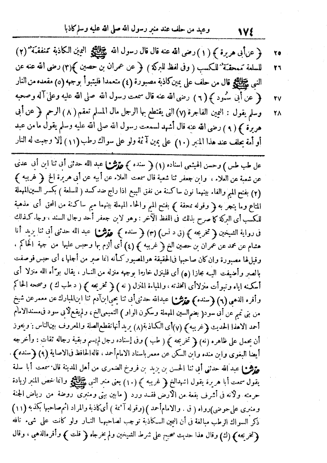 (عن أبي هريرة) رضي عنه قال: قال رسول الله صلى الله عليه وسلم اليمين الكاذبة منفقة للسلعة ممحقة للكسب (وفي لفظ للبركة) (عن عمران بن حصين) رضي الله عنه عن النبي صلى الله عليه وسلم قال من حلف على يمين كاذبة مصبورة متعمدا فليتبوأ بوجهه مقعده من النار (عن أبي سود) رضي الله عنه قال سمعت رسول الله صلى الله عليه وعلى آله وصحبه وسلم يقول: اليمين الفاجرة يقتطع بها الرجل مال المسلم تعتقم الرحم (عن أبي هريرة) رضي الله عنه قال أشهد لسمعت رسول الله صلى الله عليه وسلم يقول ما من عبد أو أمة يحلف عند هذا المنبر على آثمة ولو على سواك رطب إلا وجبت له نار