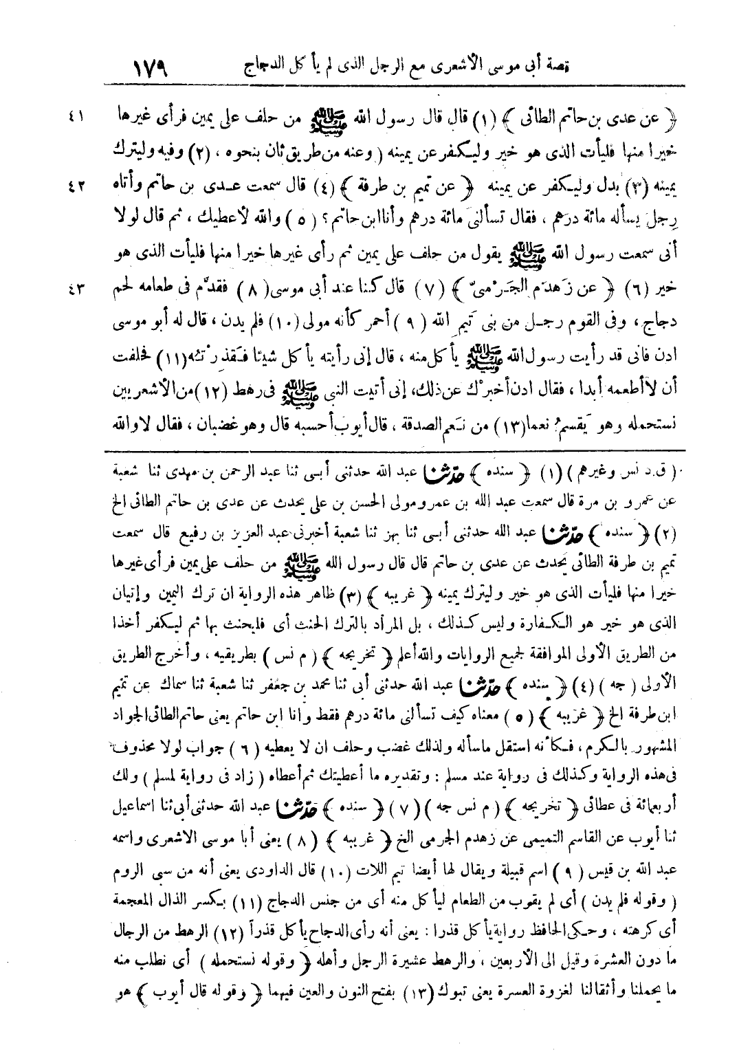 (ق. د نس وغيرهم) (سنده) حدثنا عبد الله حدثني أبي ثنا عبد الرحمن بن مهدي ثنا شعبة عن عمرو بن مرة قال سمعت عبد الله بن عمرو مولى الحسن بن علي يحدث عن عدي بن حتم الطائي الخ (سنده) حدثنا عبد الله حدثني أبي ثنا بهز ثنا شعبة أخبرني عبد العزيز بن رفيع قال سمعت تميم بن طرفة الطائي يحدث عن عدي بن حاتم قال: قال رسول الله صلى الله عليه وسلم من حلف على يمين فرأى غيرهما خيرا منها فليأت الذي هو خير وليترك يمينه (غريبة) ظاهر هذه الرواية أن ترك اليمين وإتيان الذي هو خير هو الكفارة وليس كذلك، بل المراد بالترك الحنث أي فليحنث بها ثم ليكفر أخذا من الطريق الأولى الموافقة لجميع الروايات والله أعلم (تخريجه) (م نس) بطريقيه، وأخرج الطريق الأولى (جه) (سنده) حدثنا عبد الله حدثني أبي ثنا محمد بن جعفر ثنا شعبة ثنا سماك عن تميم ابن طرفة الخ (غريبة) معناه كيف تسألني مائة درهم فقط وأنا ابن حاتم يعني حاتم الطائي الجواد المشهور بالكرم، فكأنه استقل ما سأله ولذلك غضب وحلف أن لا يعطيه جواب لولا محذوف في هذه الرواية وكذلك في رواية عند مسلم: وتقديره ما أعطيتك ثم أعطاه (زاد في رواية لمسلم) ولك أربعمائة في عطائي (تخريجه) (م نس جه) (سنده) حدثنا عبد الله حدثني أبي ثنا إسماعيل عبد الله بن قيس اسم قبيلة ويقال لها أيضا تيم اللات قال الداودي يعني أنه من سبي الروم (وقوله قلم يدن) أي ليقرب من الطعام ليأكل منه أي من جنس الدجاج بكسر الذال المعجمة أي كرهته، وحكى الحافظ رواية يأكل قذرا: يعني أنه رأى الدجاج بكسر الذال المعجمة أي كرهته، وحكى الحافظ رواية يأكل قذرا: يعني أن رأى الدجاج يأكل قذرا الرهط من الرجال ما دون العشرة وقيل إلى الأربعين، والرهط عشيرة الرجل وأهله (وقوله نستحمله) أي نطلب منه ما يحملنا وأثقالنا لغزوة العسرة يعني تبوك بفتح النون والعين فيهما (وقوله قال أيوب) هو