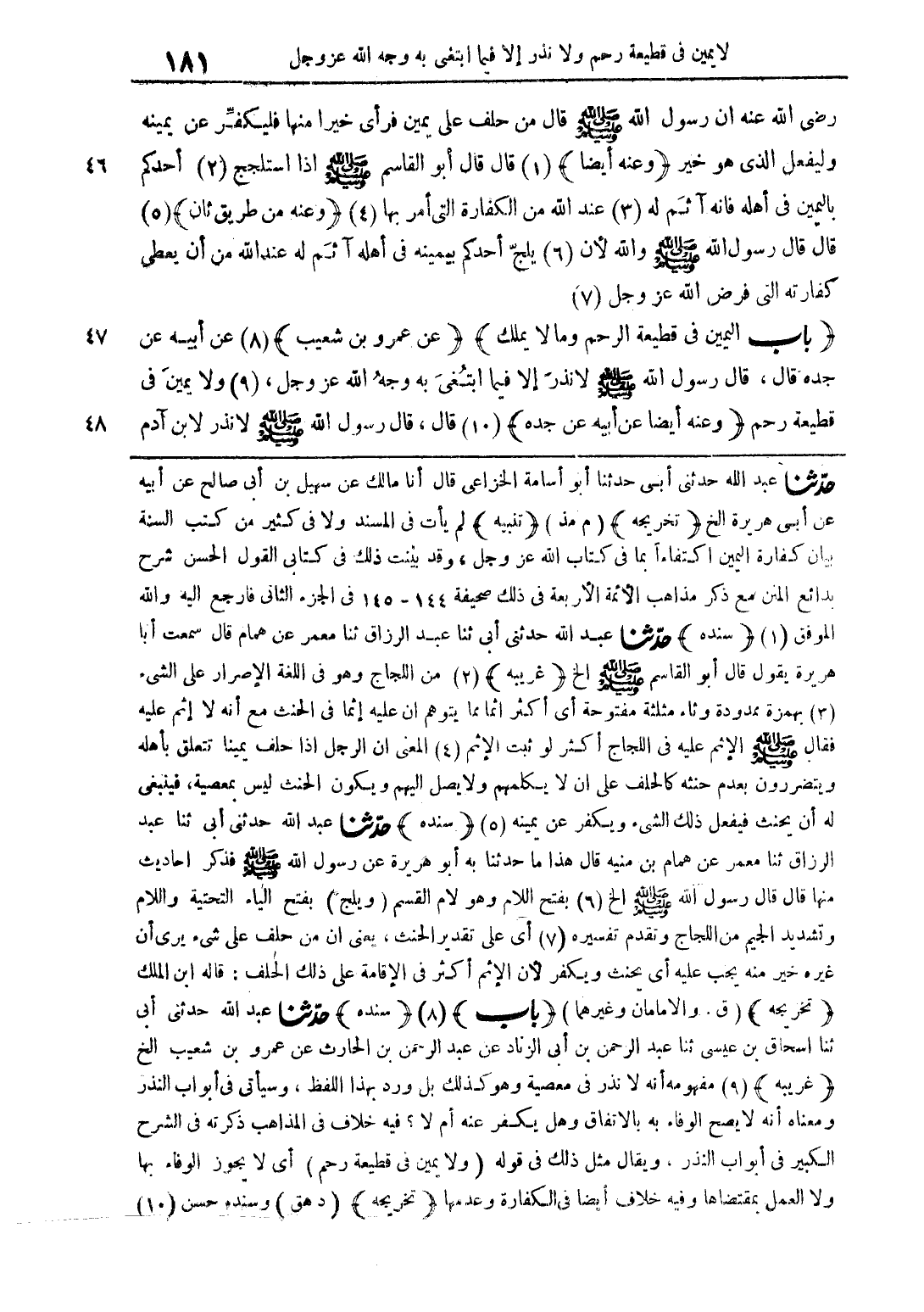 حدثنا عبد الله حدثني أبي ثنا أبو أسامة الخزاعي قال أنا مالك عن سهيل بن أبي صالح عن أبيه عن أبي هريرة الخ (تخريجه) (م مذ) (تنبيه) لم يأت في المسند ولا في كثير من الكتب السنة بيان كفارة اليمين إكتفاء بما في كتاب الله عز وجل، وقد بينت ذلك في كتابي القول الحسن شرح بدائع المنن مع ذكر مذاهب الأئمة الأربعة في ذلك صحيفة 144 - 145 - في الجزء الثاني فارجع إليه والله الموفق (سنده) حدثنا عبد الله حدثني أبي ثنا عبد الرازق ثنا معمر عن همام قال سمعت أبا هريرة يقول قال أبو القاسم صلى الله عليه وسلم الخ (غريبة) من اللجاج وهو اللغة الإصرار على الشيء بهمزة ممدودة وثاء مثلثة مفتوحة أي أكثر إثما مما يتوهم أن عليه إثما في الحنث مع أنه لا إثم عليه فقال صلى الله عليه وسلم الإثم عليه اللجاج أكثر لو ثبت الإثم المعنى أن الرجل إذا حلف يمينا تتعلق بأهله ويتضررون بعدم حنثه كالحلف على أن لا يكلمهم ولا يصل إليهم ويكون الحنث ليس بمعصية، فينبغي له أن يخنث فيفعل ذلك الشيء ويكفر عن يمينه (سنده) حدثنا عبد الله حدثني أبي ثنا عبد الرزاق ثنا معمر عن همام بن منيه قال هذا ما حدثنا به أبو هريرة عن رسول الله صلى الله عليه وسلم فذكر أحاديث منها قال: قال رسول الله صلى الله عليه وسلم الخ بفتح اللام وهو لام القسم (ويلج) بفتح الياء التحتية واللام وتشديد الجيم من اللجام وتقدم تفسيره أي على تقدير الحنث، يعني أن من حلف على شيء يرى أن غيره خير منه يجب عليه أي يحنث ويكفر لأن الإثم أكثر في الإقامة على ذلك الحلف: قاله ابن مالك (تخريجه) (ق. والإمامان وغيرهما) (باب) (سنده) حدثنا عبد الله حدثني أبي ثنا إسحاق بن عيسى ثنا عبد الرحمن بن أبي الزناد عن عبد الرحمن بن الحارث عن عمرو بن شعيب الخ (غريبة) مفهومه أنه لا نذر في معصية وهو كذلك بل ورد بهذا اللفظ، وسيأتي في أبواب النذر ومعناه أنه لا يصح الوفاء به بالاتفاق وهل يكفر عنه أم لا؟ فيه خلاف في المذاهب ذكرته في الشرح الكبير في أبواب النذر، ويقال مثل ذلك في قوله (ولا يمين في قطيعة رحم) أي لا يجوز الوفاء بها ولا العمل بمقتضاها وفيه خلاف أيضا في الكفارة وعدمها (تخريجه) (د هق) وسنده حسن