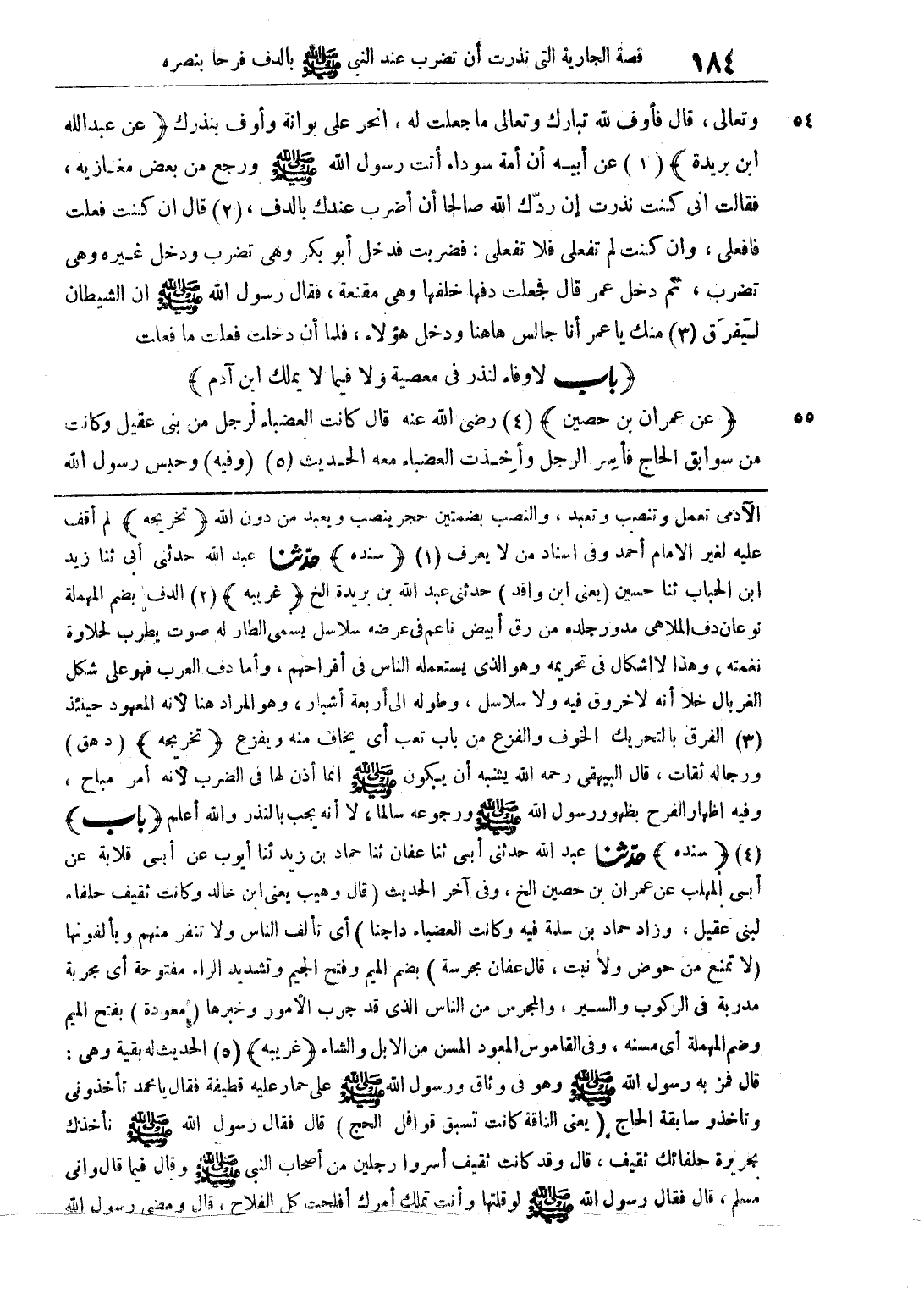 الآدمي تعمل وتنصب وتعبد، والنصب بضمتين حجر ينصب ويعبد من دون الله (تخريجه) لم أقف عليه لغير الإمام أحمد وفي إسناده من لا يعرف (سنده) حدثنا عبد الله حدثني أبي ثنا زيد ابن الحباب ثنا حسين (يعني ابن واقد) حدثني عبد الله بن بريدة الخ (غريبة) الدف بضم المهملة نوعان دف الملاهي مدور جلده من رق أبيض ناعم في عرضه سلاسل يسمى الطار له صوت يطرب لحلاوة نغمته، وهذا لا إشكال في تحريمه وهو الذي يستعمله الناس في أفراحهم، وأما دف العرب فهو على شكل الغربال خلا أنه لا خروق فيه ولا سلاسل، وطوله إلى أربعة أشبار، وهو المراد هنا لأنه المعهود حينئذ الفرق بالتحريك الخوف والفزع من باب تعب أي يخاف منه ويفزع (تخريجه) (د هق) ورجاله ثقات، قال البيهقي رحمه الله يشبه أن يكون صلى الله عليه وسلم ورجوعه سالما، لا لأنه يجب بالنذر والله أعلم (باب) (سنده) حدثنا عبد الله حدثني أبي ثنا عفان ثنا حماد بن زيد ثنا أيوب عن أبي قلابة عن أبي المهلب عن عمران بن حصين الخ، وفي آخر الحديث (قال وهيب يعني ابن خالد وكانت ثقيف حلفاء لبني عقيل، وزاد حماد بن سلمة فيه وكانت العضباء داجنا) أي تألف الناس ولا تنفر منهم ويألفونها (لا تمنع من حوض ولا نبت، قال عفان مجرسة) بضم الميم وفتح الجيم وتشديد الراء مفتوحة أي مجربة مدربة في الركوب والسير، والمجرس من الناس الذي قد جرب الأمور وخبرها (معودة) بفتح الميم وضم المهملة أي مسنة، وفي القاموس المعود المسن من الإبل والشاء (غريبة) الحديث له بقية وهي: قال فمز به رسول الله صلى الله عليه وسلم وهو في وثاق ورسول الله صلى الله عليه وسلم على حمار عليه قطيفة فقال يا محمد تأخذوني وتأخذوا سابقة الحاج (يعني الناقة كانت تسبق قوافل الحج) قال فقال رسول الله صلى الله عليه وسلم أخذك بحيرة حفائك ثقيف، قال وقد كانت ثقيف أسروا رجلين من أصحاب النبي صلى الله عليه وسلم وقال فيما قال وإني مسلم، قال فقال رسول الله صلى الله عليه وسلم لو قلتها وأنت تملك أمرك أفحت كل الفلاح، قال ومضى رسول الله