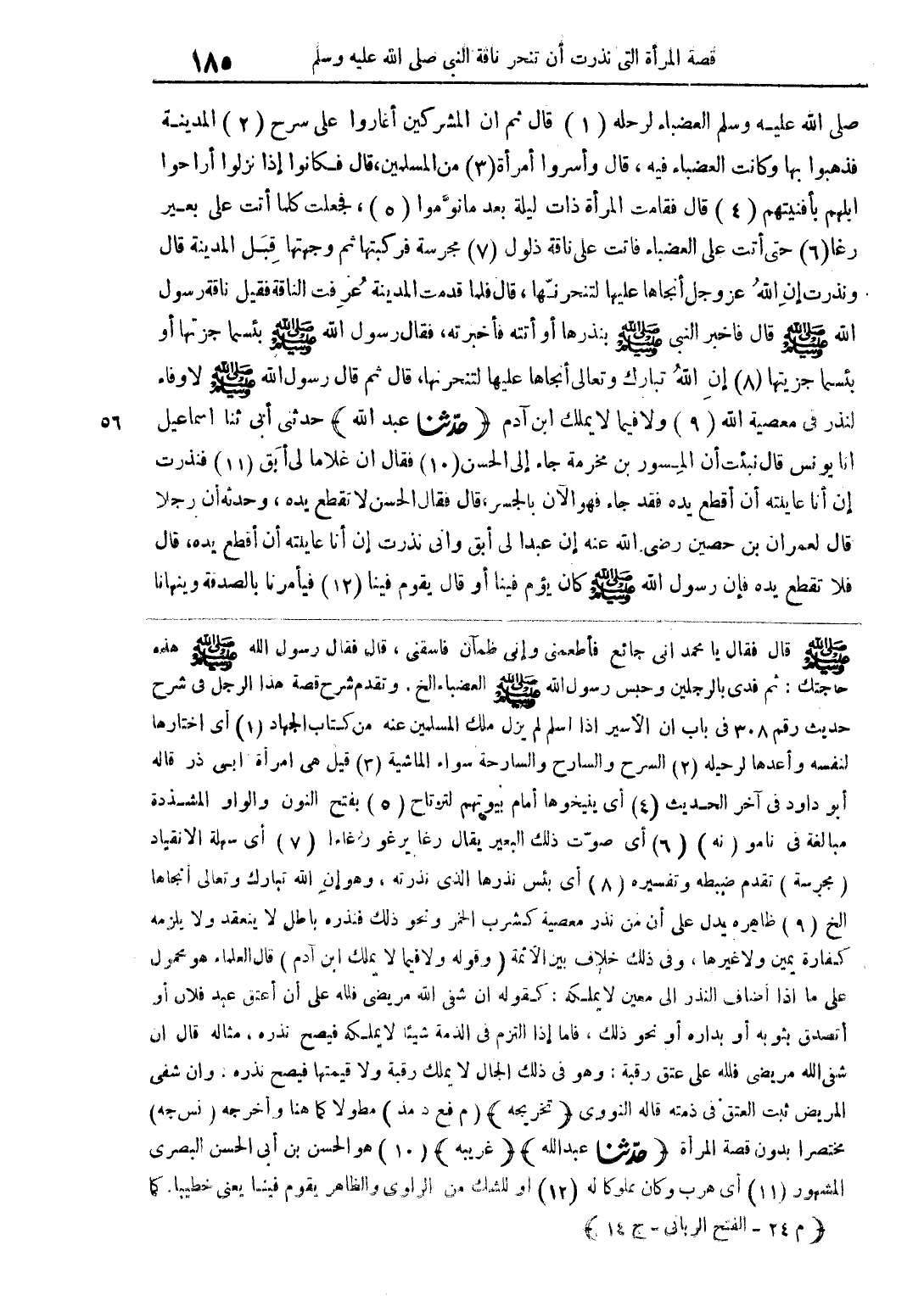 (مجرسة) تقدم ضبطه وتفسيره أي بئس نذرها الذي نذرته، وهو إن الله تبارك وتعالى أنجاها الخ ظاهره يدل على أن من نذر معصية كشرب الخمر ونحو ذلك فنذره باطل لا ينعقد ولا يلزمه كفاره يمين ولا غيرها، وفي ذلك خلاف بين الأئمة (وقوله ولا فيها لا يملك ابن آدم) قال العلماء هو محمول على ماذا أضاف النذر إلى معين لا يملكه: كقوله إن شفي الله مريضي فله أن أعتق عبد فلان أو أتصدق بثوبه أو بداره أو نحو ذلك، فأما إذا التزم في الذمة شيئا لا يملكه فيصح نذره، مثال قال أن شفى الله مريضي فله عتق رقبة: وهو في ذلك الجال لا يملك رقبة ولا قيمتها فيصح نذره. وإن شفى المريض ثبت العتق في ذمته قاله النووي (تخريجه) (م فع د مذ) مطولا كما هنا وأخرجه (نس جه) مختصرا بدون قصة المرأة (حدثنا عبد الله) (غريبة) هو الحسن بن أبي الحسن البصري المشهور أي هرب وكان مملوكا له أو للشك من الراوي والظاهر يقوم فينا يعني خطيبا كما