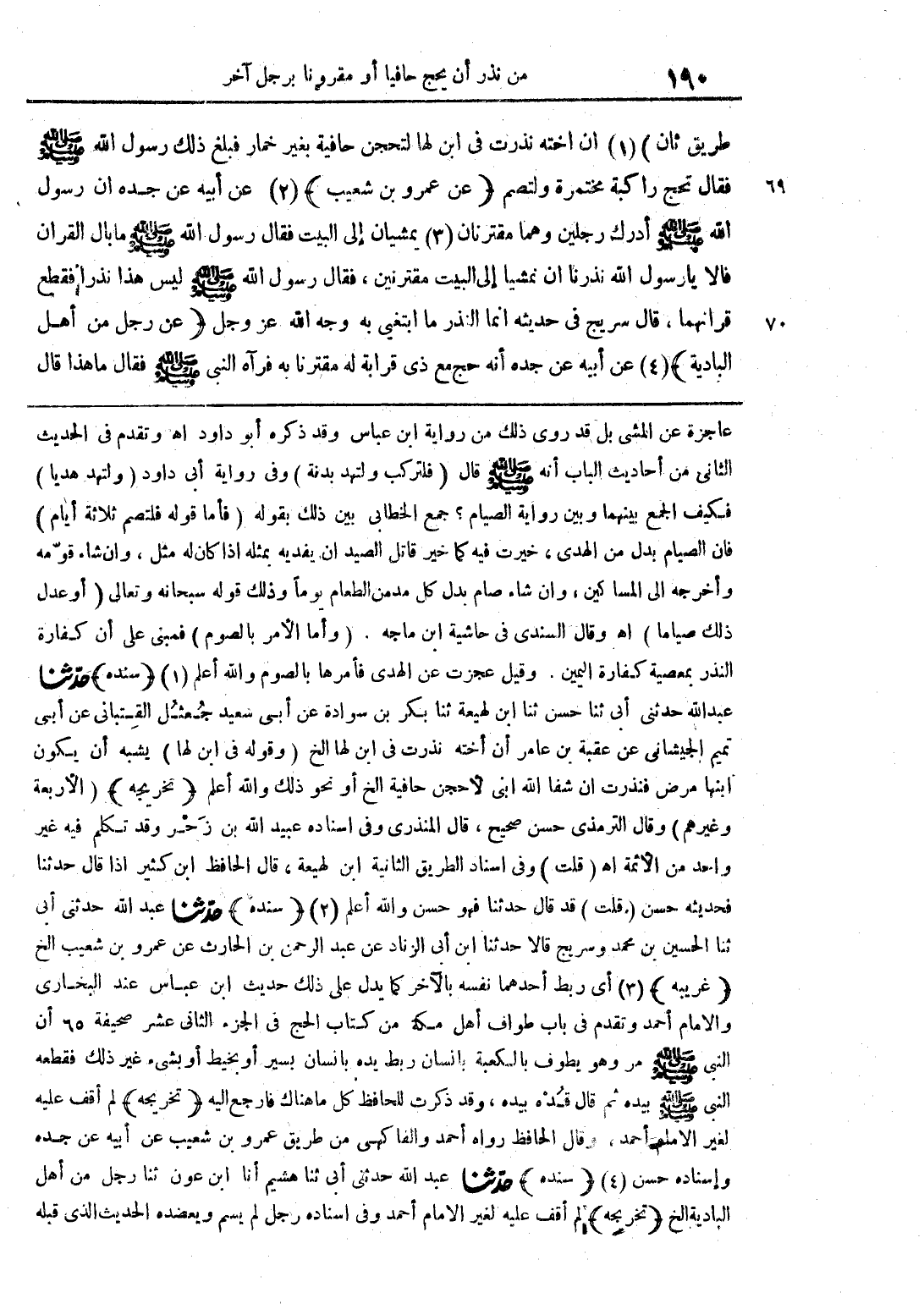 طريق ثان) أن أخته نضرت في ابن لها لتحجن حافية بغير خمار فبلغ ذلك رسول الله صلى الله عليه وسلم فقال تحج راكبة مختمرة ولتصم (عن عمرو بن شعيب) عن أبيه عن جده أن رسول الله صلى الله عليه وسلم أدرك رجلين وهما مقترنان يمشيان إلى البيت فقال رسول الله صلى الله عليه وسلم ما بال القران قلا يا رسول الله نذرنا أن نمشي إلى البيت مقترنين، فقال رسول الله صلى الله عليه وسلم ليس هذا نذرا فقطع قرانهما، قال سريج في حديثه إنما النذر ما ابتغى به وجه الله عز وجل (عن رجل من أهل البادية) عن أبيه عن جده أنه حج مع ذي قرابة له مقترنا به فرآه النبي صلى الله عليه وسلم فقال ما هذا قال