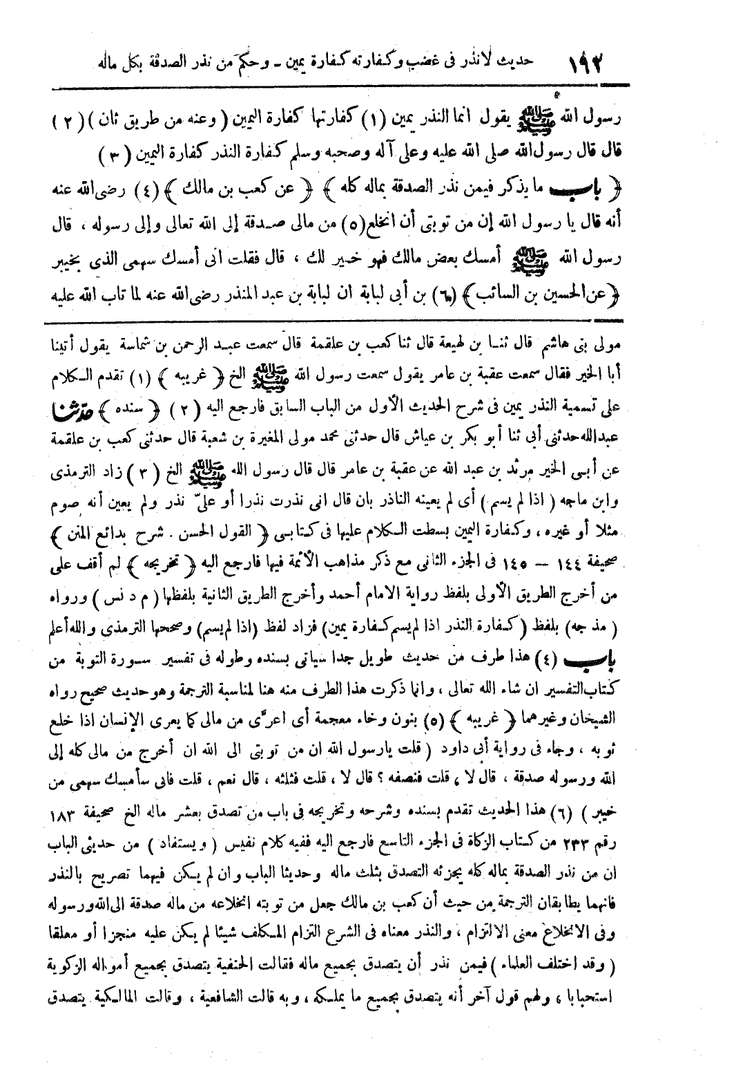 مولى بني هاشم قال ثنا بن لهيعة قال ثنا كعب بن علقمة قال سمعت عبد الرحمن بن الرحمن بن شماسة يقول أتينا أبا الخير فقال سمعت عقبة بن عامر يقول سمعت رسول الله صلى الله عليه وسلم الخ (غريبة) تقدم الكلام على تسمية النذر يمين في شرح الحديث الأول من الباب السابق فارجع إليه (سنده) حدثا عبد الله حدثني أبي ثنا أبو بكر بن عياش قال حدثني محمد مولى المغيرة بن شعبة قال حدثني كعب بن علقمة عن أبي الخير مرثد بن عبد الله عن عقبة بن عامر قال: قال رسول الله صلى الله عليه وسلم الخ زاد الترمذي وابن ماجة (إذا لم يسمى) أي لم يعينه الناذر بأن قال إني نذرت نذرا أو على نذر ولم يعين أنه صوم مثلا أو غيره، وكفارة اليمين بسطت الكلام عليها في كتابي (القول الحسن شرح بدائع المنن) صحيفة 144 - 145 في الجزء الثاني مع ذكر مذاهب الأئمة فيها فارجع إليه (تخريجه) لم أقف على من أخرج الطريق الأولى بلفظ رواية الإمام أحمد وأخرج الطريق الثانية بلفظها (م د نس) ورواه (مذ جه) بلفظ (كفارة النذر إذا لم يسم كفارة يمين) فزاد لفظ (إذا لم يسم) وصححها الترمذي والله أعلم باب هذا طرف من حديث طويل جدا سيأتي بسنده وطوله في تفسير سورة التوبة من كتاب التفسير إن شاء الله تعالى، وإنما ذكرت هذا الطرف منه هنا لمناسبة الترجمة وهو حديث صحيح رواه الشيخان وغيرهما (غريبة) بنون وخاء معجمة أي أعرى من مالي كما يعري الإنسان إذا خلع ثوبه، وجاء في رواية أبي داود (قلت يا رسول الله إن من توبتي إلى الله أن أخرج من مالي كله إلى خيبر) هذا الحديث تقدم بسنده وشرحه وتخريجه في باب من تصدق بعشر ماله الخ صحيفة 183 رقم 233 من كتاب الزكاة في الجزء التاسع فارجع إليه ففيه كلام نفيس ويستفاد من حديثي الباب أن من نذر الصدقة بماله كله يجزئه التصدق بثل ماله وحديثا الباب وإن لم يكن فيهما تصريح بالنذر فإنهما يطابقان الترجمة من حيث أن كعب بن مالك جعل من توبته انخلاعه من ماله صدقة إلى الله ورسوله وفي الانخلاع معنى الالتزام، والنذر معناه في الشرع التزام المكلف شيئا لم يكن عليه منجزا أو معلقا (وقد اختلف العلماء) فيمن نذر أن يتصدق بجميع ماله فقالت الحنفية يتصدق بجميع أمواله الزكوية استحبابا، ولهم قول آخر أنه يتصدق بجميع ما يملكه، وبه قالت الشافعية، وقالت المالكية يتصدق