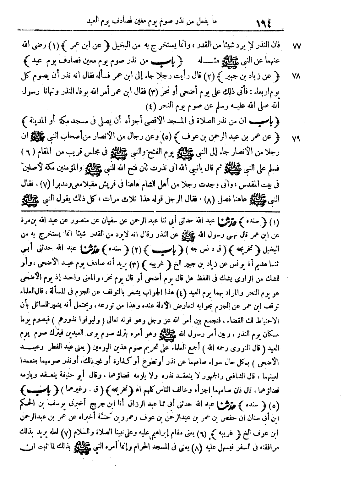 (سنده) حدثنا عبد الله حدثني أبي ثنا عبد الرحمن عن سفيان عن منصور عن عبد الله بن مرة عن ابن عمر قال نهى رسول الله صلى الله عليه وسلم عن النذر وقال أنه لا يرد من القدر شيئا إنما يستخرج به من البخيل (تخريجه) (ق د نس جه) (باب) (سنده) حدثنا عبد الله حدثني أبي ثنا هشم أنا يونس عن زياد بن جبير الخ (غريبة) يريد أنه صادف يوم عيد الأضحى، وأو للشك من الراوي يشك في اللفظ هل قال يوم الأضحى أو قال يوم نحر، والمعنى واحد إذ يوم الأضحى هو يوم النحر والمراد بهما يوم العيد هذا الجواب يشعر بالتوقف عن الجزم في المسألة، قال العلماء توقف ابن عمر عن الجزم بجوابه لتعارض الأدلة عنده وهذا من تورعه، ويحتمل أنه يشير للسائل بأن الاحتياط لك القضاء، فتجمع بين أمر الله عز وجل وهو قوله تعالى (وليوفوا نذورهم) فيصوم يوما مكان يوم النذر، وبين أمر رسول الله صلى الله عليه وسلم وهو أمره بترك صوم يومي العيدين فيترك صوم يوم العيد (قال النووي رحمه الله) أجمع العلماء على تحريم صوم هذين اليومين (يعني عيد الفطر وعيد الأضحى) بكل حال سواء صامهما عن نذر أو تطوع أو كفارة أو غير ذلك، أو نذر صومهما متعمدا لعينهما، قال الشافعي والجمهور لا ينعقد نذره ولا يلزمه قضاؤهما، وقال أبو حنيفة ينعقد ويلزمه قضاؤهما، قال فإن صامهما أجزأه وخالف الناس كلهم اهـ (تخريجه) (ق. وغيرهما) (باب) (سنده) حدثنا عبد الله حدثني أبي ثنا عبد الرزاق أنا ابن جريج أخبرني يوسف بن الحكم ابن أبي سنان أن حفص بن عمر بن عبد الرحمن بن عوف وعمرو بن حنة أخبراه عن عمر بن عبد الرحمن ابن عوف الخ (غريبة) يعني مقام إبراهيم عليه وعلى نبينا الصلاة والسلام لعله يريد بذلك مرافقته في السفر فيسهل عليه يعني في المسجد الحرام وإنما أمره النبي صلى الله عليه وسلم بذلك لما ثبت أن