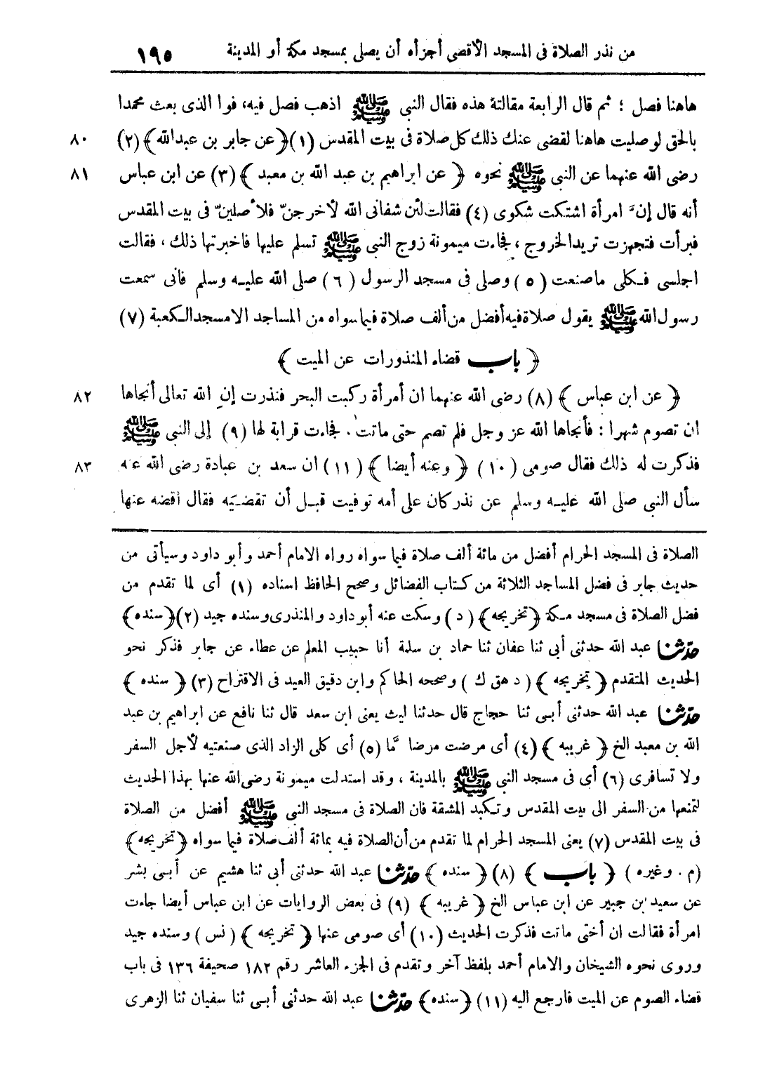هاهنا فصل، ثم قال الرابعة مقالته هذه فقال النبي صلى الله عليه وسلم اذهب فصل فيه، فو الذي بعث محمدا بالحق لو صليت هاهنا لقضى عنك كل صلاة في بيت المقدس (عن جابر بن عبد الله) رضي الله عنهما عن النبي صلى الله عليه وسلم نحوه (عن إبراهيم بن عبد الله بن معبد) عن ابن عباس أنه قال إن امرأة اشتكت شكوى فقالت لئن شفاني الله لأخرجن فلأصلين في بيت المقدس فبرأت فتجهزت تريدا الخروج، فجاءت ميمونة زوج النبي صلى الله عليه وسلم تسلم عليها فأخبرتها ذلك، فقالت