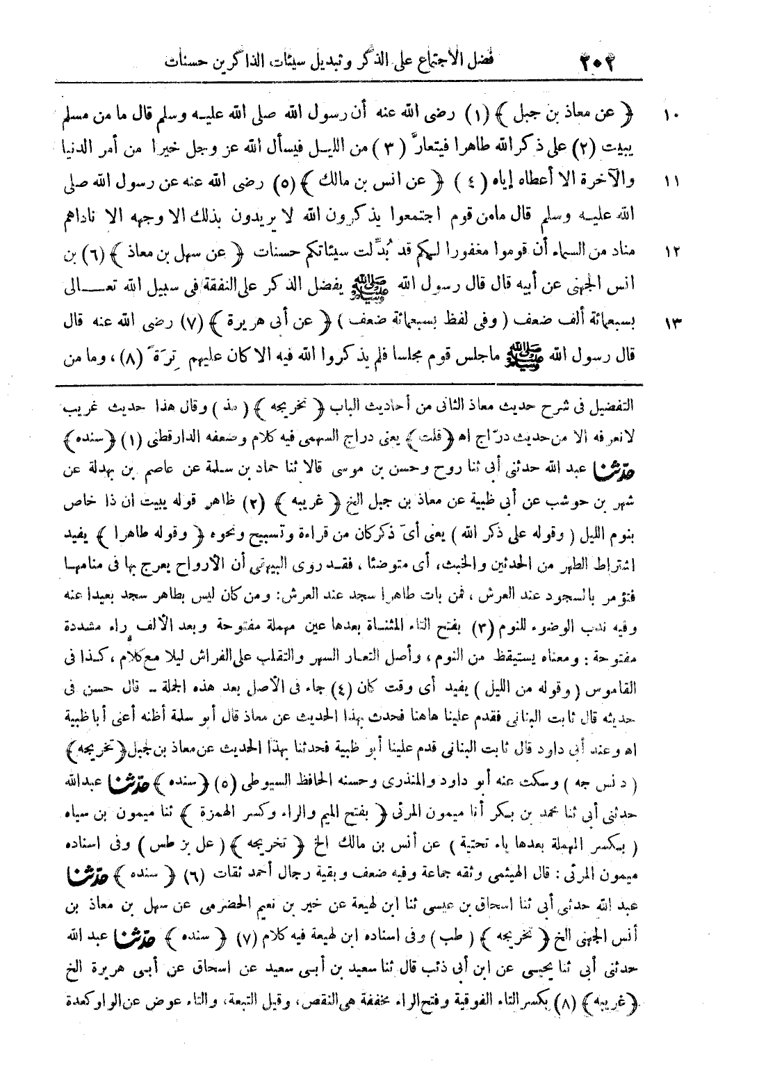 (عن معاذ بن جبل) رضي الله عنه أن رسول الله صلى الله عليه وسلم قال ما من مسلم يبيت على ذكر الله طاهرا فيتعار من الليل فيسأل الله عز وجل خيرا من أمر الدنيا والآخرة إلا أعطاه إياه (عن أنس بن مالك) رضي الله عنه عن رسول الله صلى الله عليه وسلم قال ما من قوم اجتمعوا يذكرون الله لا يريدون بذلك إلا وجهه إلا ناداهم مناد من السماء أن قوموا مغفورا لكم قد بدلت سيئاتكم حسنات (عن سهل بن معاذ) بن أني الجهني عن أبيه قال: قال رسول الله صلى الله عليه وسلم يفضل الذكر على النفقة في سبيل الله تعالى بسبعمائة ألف ضعف (وفي لفظ بسبعمائة ضعف) (عن أبي هريرة) رضي الله عنه قال: قال رسول الله صلى الله عليه وسلم ما جلس قوم مجلسا فلم يذكروا الله فيه إلا كان عليهم ترة، وما من