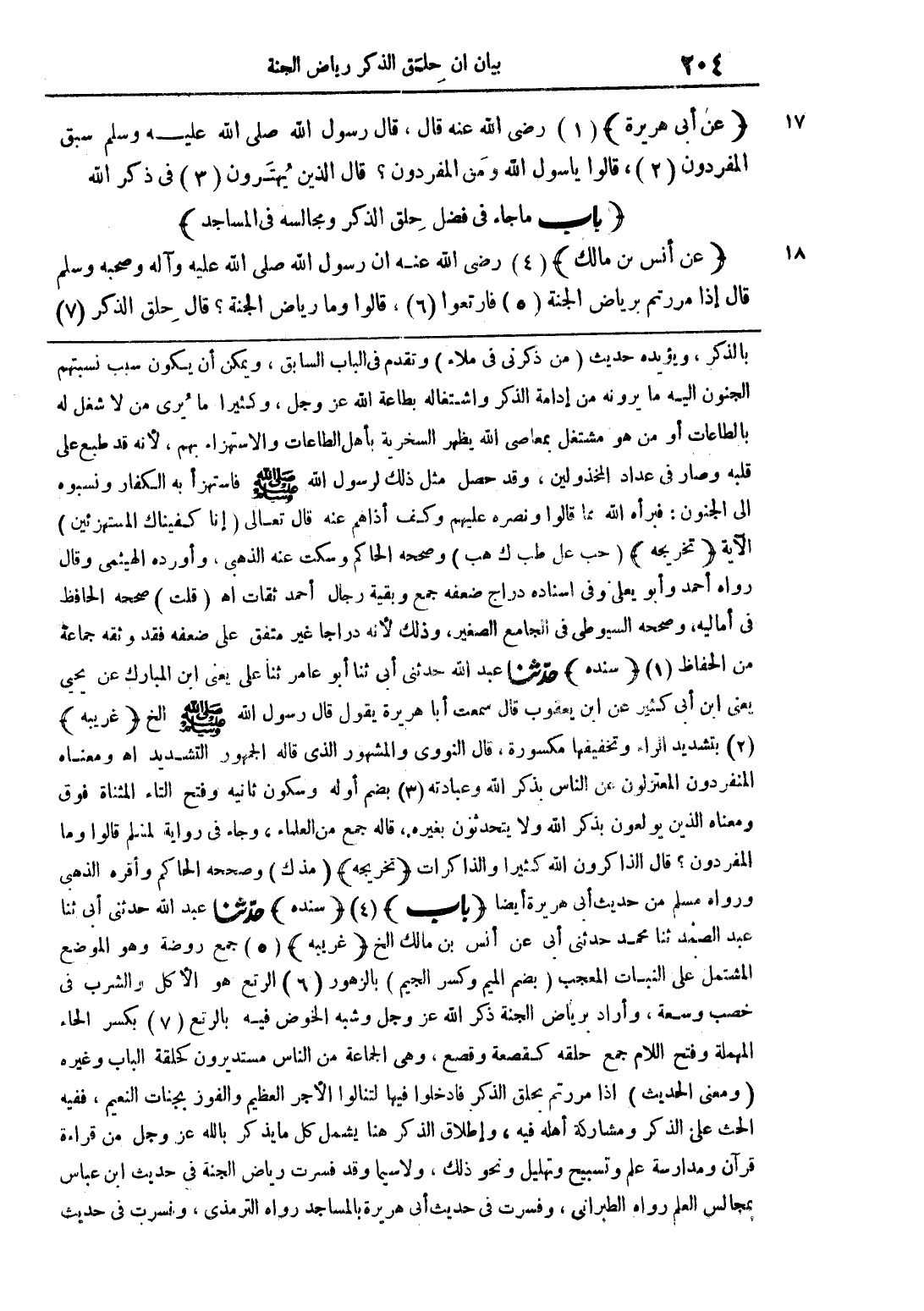 بالذكر، ويؤيده حديث (من ذكرني في ملأ) وتقدم في الباب السابق، ويمكن أن يكون سبب نسبتهم الجنون إليه ما يرونه من إدامة واشتغاله بطاعة الله عز وجل، وكثيرا ما يرى من لا شغل له بالطاعات أو من هو مشتغل بمعاصي الله يظهر السخرية بأهل الطاعات والاستهزاء بهم، لأنه قد طبع على قلبه وصار في عداد المخذولين، وقد حصل مثل ذلك لرسول الله صلى الله عليه وسلم فاستهزأ به الكفار ونسبوه إلى الجنون: فأبره الله مما قالوا ونصره عليهم أذاهم وكف أذاهم عنه قال تعالى (إن كفيناك المستهزئين) الآية (تخريجه) حب عل طب ك هب) وصححه الحاكم وسكت عنه الذهبي، وأورده الهيثمي وقال رواه أحمد وأبو يعلى وفي إسناده دراج ضعفه جمع وبقية رجال أحمد ثقات اهـ (قلت) صححه الحافظ في أماليه، وصححه السيوطي في الجامع الصغير، وذلك لأنه دراجا غير متفق على ضعفه فقد وثقه جماعة من الحفاظ (سنده) حدثنا عبد الله حدثني أبي ثنا أبو عامر ثنا علي يعني ابن المبارك عن يحيى يعني ابن أبي كثير عن ابن يعقوب قال سمعت أبا هريرة يقول قال رسول الله صلى الله عليه وسلم الخ (غريبة) بتشديد الراء وتخفيفها مكسورة، قال النووي والمشهور الذي قاله الجمهور التشديد اهـ وعناه المنفردون المعتزلون عن الناس بذكر الله وعبادته بضم أوله وسكون ثانية وفتح التاء المثناة فوق ومعناه الذين يولعون بذكر الله ولا يتحدثون بغير، قاله جمع من العلماء، وجاء في رواية لمسلم قالوا وما المفردون؟ قال الذاكرون الله كثيرا والذاكرات (تخريجه) (مذ ك) وصححه الحاكم وأقره الذهبي ورواه مسلم من حديث أبي هريرة أيضا (باب) (سنده) حدثنا عبد الله حدثني أبي ثنا عبد الصمد ثنا محمد حدثني أبي عن أنس بن مالك الخ (غريبة) جمع روضة وهو الموضع المشتمل على النبات المعجب (بضم الميم وكسر الجيم) بالزهور الرتع هو الأكل والشرب في خصب وسعة، وأراد برياض الجنة ذكر الله عز وجل وشبه الخوض فيه بالرتع بكسر الحاء المهملة وفتح اللام جمع حلقه كقصعة وقصع، وهي الجماعة من الناس مستعدون كحلقة الباب وغيره (ومعنى الحديث) إذا مررتم بحلق الذكر فادخلوا فيها لتنالوا الأجر العظيم والفوز بجنات النعيم، ففيه الحث على الذكر ومشاركة أهله فيه، وإطلاق الذكر هنا يشمل ما يذكر بالله عز وجل من قراءة قرآن ومدارسة علم وتسبيح وتهليل ونحو ذلك، ولا سيما وقد فسرت رياض الجنة في حديث ابن عباس بمجالس العلم رواه الطبراني، وفسرت في حديث أبي هريرة بالمساجد رواه الترمذي، وفسرت في حديث
