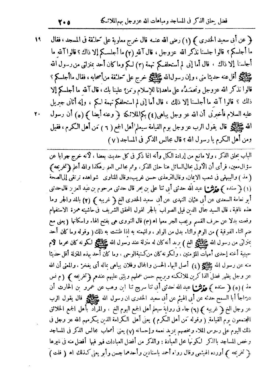 الباب بحلق الذكر، ولا مانع من إرادة الكل وأنه إنما ذكر في كل حديث بعضا، لأنه خرج جوابا عن سؤال معين، فرأى أن الأولى بحال السائل هنا حلق الذكر، وثم مجالس العلم والله أعلم (تخريجه) (مذ) البيهقي في شعب الإيمان، وقال الترمذي حسن غريب، وقال المناوي شواهده ترتقي إلى الصحة (سنده) حدثنا عبد الله حدثني أبي ثنا علي بن بحر قال حدثني مرحوم بن عبد العزيز قال حدثني أبو نعامة السعدي عن أبي عثمان النهدي عن أبي سعيد الخدري الخ (غريبة) بالمد والجر وما هذه نافية، قال السيد جمال الدين قيل الصواب بالجر لقول المحقق الشريف في حاشيته همزة الاستفهام وقعت بدلا عن حرف القسم ويجب الجر معها اهـ قال النووي هي بفتح الهاء وإسكانها (يعني مع ضم التاء الفوقية) من الوهم والتاء بدل من الواو، واتهمته به إذا ظننت به ذلك (وقوله وما كان لأحد بمنزلتي من رسول الله صلى الله عليه وسلم الخ) يريد أنه كان له منزلة عند رسول الله صلى الله عليه وسلم لكونه كان محرما لأم حبيبة أخته إحدى أمهات المؤمنين، ولكونه كان من كتبة الوحي، وما كان أحد بهذه المنزلة أقل حديثا منه عن رسول الله صلى الله عليه وسلم أصل البهاء الحسن والجمال وفلان يباهي بماله أي يفخر، والمعنى أن الله عز وجل يظهر فضل الذاكرين لملائكته ويريهم حسن عملهم ويثني عليهم عندهم (تخريجه) (م نس مذ) (سنده) حدثنا عبد اله حدثني أبي ثنا سريج ثنا ابن وهب عن عمرو بن الحارث أن دراجا أبا السمح حدثه عن أبي الهيثم عن أبي سعيد الخدري أن رسول الله صلى الله عليه وسلم قال يقول الرب عز وجل الخ (غريبة) جاء في رواية سيعلم أهل الجمع اليوم الخ، والمراد بأهل الخلائق المجتمعون يوم القيامة (وقوله من أهل الكرم) يعني أهل الكرامة الذين يكرمهم الله عز وجل في ذلك اليوم على رؤوس الملأ ويخصهم بمزيد نعمه وإحسانه يعني أصحاب مجالس الذكر في المساجد وخص المساجد بالذكر لكونها محل العبادة: والذكر من أفضل العبادات فهو فيها أفضل منه في غيرها (تخريجه) أورده الهيثمي وقال رواه أحمد بإسنا دين وأحدهما حسن وأبو يعلى كذلك اهـ (قلت)