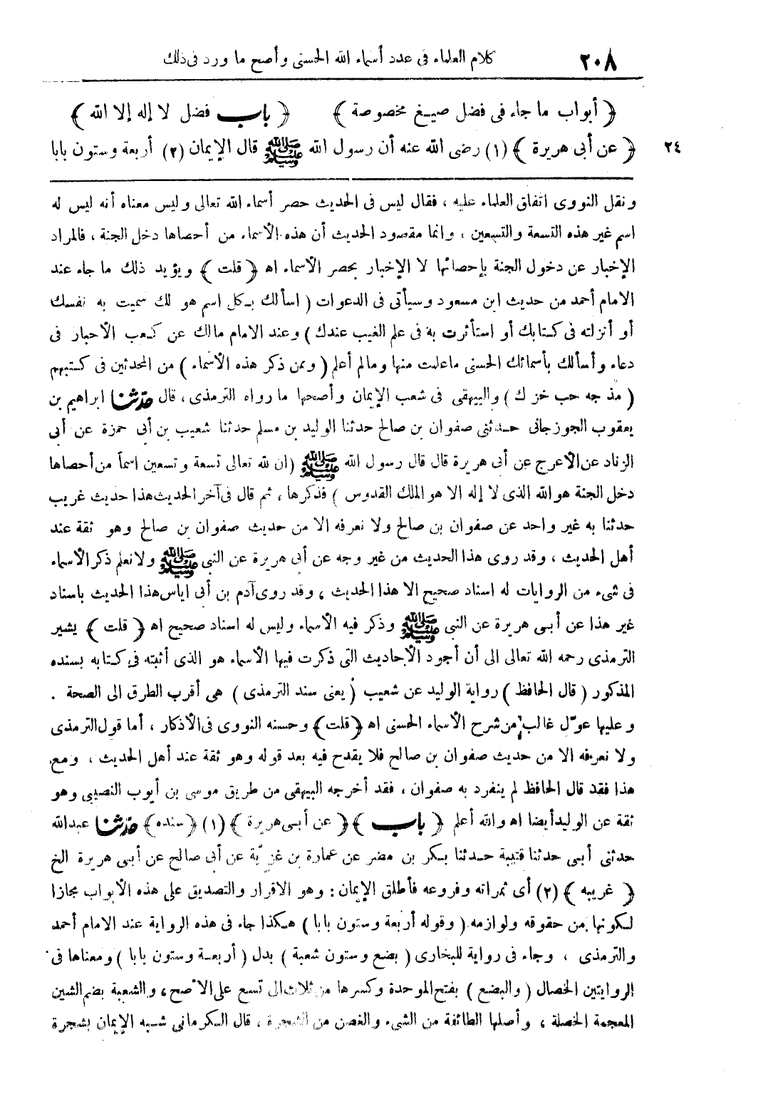 ونقل النووي اتفاق العلماء عليه، فقال ليس في الحديث حصر أسماء الله تعالى وليس معناه أنه ليس معناه أنه ليس له اسم غير هذه التسعة والتسعين، وإنما مقصود الحديث أن هذه الأسماء اهـ (قلت) ويؤيد ذلك ما جاء عند الإمام أحمد من حديث ابن مسعود وسيأتي في الدعوات (أسألك بكل اسم هو لك سميت به نفسك أو أنزلته في كتابك أو استأثرت به في علم الغيب عندك) وعند الإمام مالك عن كعب الأحبار في دعاء وأسألك بأسمائك الحسنى ما علمت منها وما لم أعلم (وممن ذكر هذه الأسماء) من المحدثين في كتبهم (مذ جه حب خز ك) والبيهقي في شعب الإيمان وأصحها ما رواه الترمذي، قال حدثنا إبراهيم بن يعقوب الجوز جاني حدثني صفوان بن صالح حدثنا الوليد بن مسلم حدثنا شعيب بن أبي حمزة عن أبي الزناد عن الأعرج عن أبي هريرة قال: قال رسول الله صلى الله عليه وسلم (إن لله تسعة وتسعين اسما من أحصاها دخل الجنة هو الله الذي لا إله إلا هو الملك القدوس) فذكرها، ثم قال آخر الحديث هذا حديث غريب حدثنا به غير واحد عن صفوان بن صالح ولا نعرفه إلا من حديث صفوان ابن صالح وهو ثقة عند أهل الحديث، وقد روى هذا الحديث من غير وجه عن أبي هريرة عن النبي صلى الله عليه وسلم ولا نعلم ذكر الأسماء في شيء من الروايات له إسناد صحيح إلا هذا الحديث، وقد روى آدم بن أبي إياس هذا الحديث بإسناد غير هذا عن أبي هريرة عن النبي صلى الله عليه وسلم ذكر فيه الأسماء وليس له إسناد صحيح اهـ (قلت) يشير الترمذي رحمه الله تعالى إلى أن أوجود الأحاديث التي ذكرت فيها الأسماء هو الذي أثبته في كتابه بسنده المذكور (قال الحافظ) رواية الوليد عن شعيب (يعني سند الترمذي) هي أقرب الطرق إلى الصحة وعليها عول غالب من شرح الأسماء الحسنى اهـ (قلت) وحسنه النووي في الأذكار، أما قول الترمذي ولا نعرفه إلا من حديث صفوان بن صالح فلا يقدح فيه بعد قوله وهو ثقة عند أهل الحديث، ومع هذا فقد قال الحافظ لم ينفرد به صفوان، فقد أخرجه البيهقي من طريق موسى بن أيوب النصيبي وهو ثقة عن الوليد أيضا اهـ والله أعلم (باب) (عن أبي هريرة) (سنده) حدثنا عبد الله حدثني أبي ثنا قتيبة حدثنا بكر بن مضر عن عمارة بن غزرية عن أبي صالح عن أبي هريرة الخ (غريبة) أي ثمراته وفروعه فأطلق الإيمان: وهو الإقرار والتصديق على هذه الأبواب مجازا لكونها من حقوقه ولوازمه (وقوله أربعة وستون بابا) هكذا جاء في هذه الرواية عند الإمام أحمد والترمذي، وجاء في رواية للبخاري (بضع وستون شعبة) بدل (أربعة وستون بابا) ومعناها في الروايتين الخصال (والبضع) بفتح الموحدة وكسرها من ثلاث إلى تسع على الأصح، والشعبة بضم الشين المعجمة الخصلة، وأصلها الطائفة من الشيء والغصن من الشجرة، قال الكرماني شبه الإيمان بشجرة
