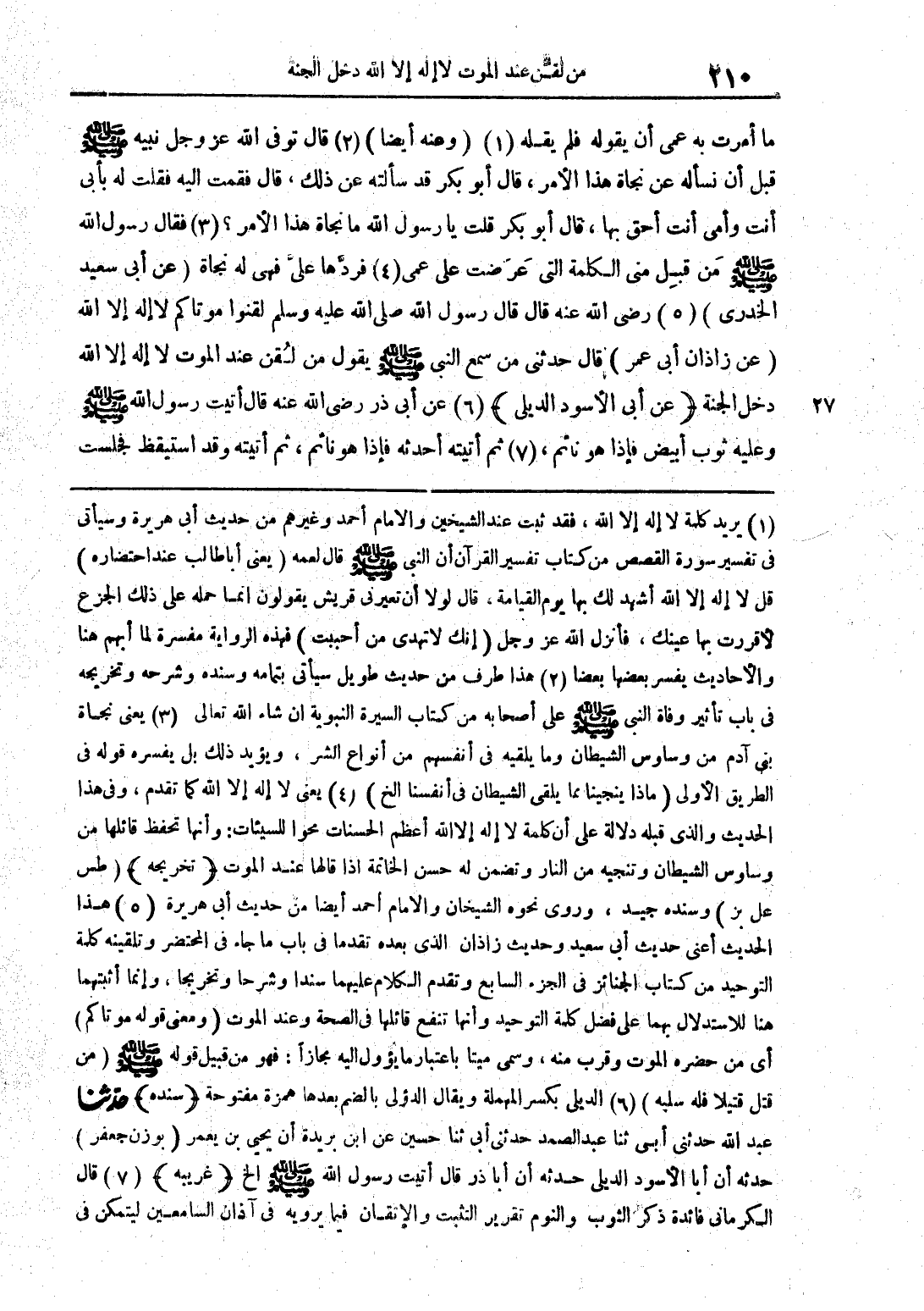 يريد كلمة لا اله إلا الله، فقد ثبت عند الشيخين والإمام أحمد وغيرهم من حديث أبي هريرة وسيأتي في تفسير سورة القصص من كتاب تفسير القرآن أن النبي صلى الله عليه وسلم قال لعمه (يعني أبا طالب عند احتضاره) قل لا اله الله أشهد لك بها يوم القيامة، قال: لولا أن تعيرني قريش يقولون أنتما حمله على ذلك الجزع لأقررت بها عينك، فأزل الله عز وجل (إنك لا تهدي من أحببت) فهذه الرواية مفسرة بما أبهم هنا والأحاديث يفسر بعضها بعضا هذا طرف من حديث طويل سيأتي بتمامه وسنده وشرحه وتخريجه في باب تأثير وفاة النبي صلى الله عليه وسلم على أصحابه من كتاب السيرة النبوية إن شاء الله تعالى يعني نجاة بني آدم من وساوس الشيطان وما يلقيه في أنفسهم من أنواع الشر ويؤيد ذلك بل يفسره قوله في الطريق ألأولى (مذ ينجينا مما يلقي الشيطان في أنفسنا الخ) يعني لا إله إلا الله كما تقدم، في هذا الحديث والذي قبله دلالة على أن كلمة لا إله غلا اله أعظم الحسنات محوا للسيئات: وأنها تحفظ قائلها من وساوس الشيطان وتضمن له حسن الخاتمة إذا قالها عند الموت (تخريجه) (طس عل بز) وسنده جيد وروى نحوه الشيخان والإمام أحمد أيضا من حديث أبي هيريرة هذا الحديث أعني حديث أبي سعيد وحديث زاد ذالك والذي بعده تقدما في باب ما جاء في المحتضر وتلقينه كلمة التوحيد من كتاب الجنائز من الجزء السابع وتقدم الكلام عليها سندا وشرحا وتخريجا، وإنما أثبتهما هنا للاستدلال بهما على فضل كلمة التوحيد أنها تنفه قائلها في الصحة وعند الموت (ومنعى قوله موتاكم) أي من حضره الموت وقرب منه، وسمى ميتا باعتبار متا يؤول عليه مجازا فهو من قبيل قوله صلى الله عليه وسلم (من قتل قتيلا فله سلبه) الديلي بكسر المهملة ويقال الدؤلي بالضم بعدها همزة مفتوحة (سنده) حدثنا عبد الله حدثني أبي ثنى عبد الصمد حدثني أبي ثنى حسين عن ابن بريدة أن يحيى بن يعمر (بوزن جعفر) حدثه أن أبا الأسود الديلي حدثه أن أبا ذر قال أتيت رسول الله صلى الله عليه وسلم الخ (غريبة) قال الكرماني فائدة ذكر الثوب والنوم تقرير التثبت والاتقان فيما يرويه في آذان السامعين ليتمكن في