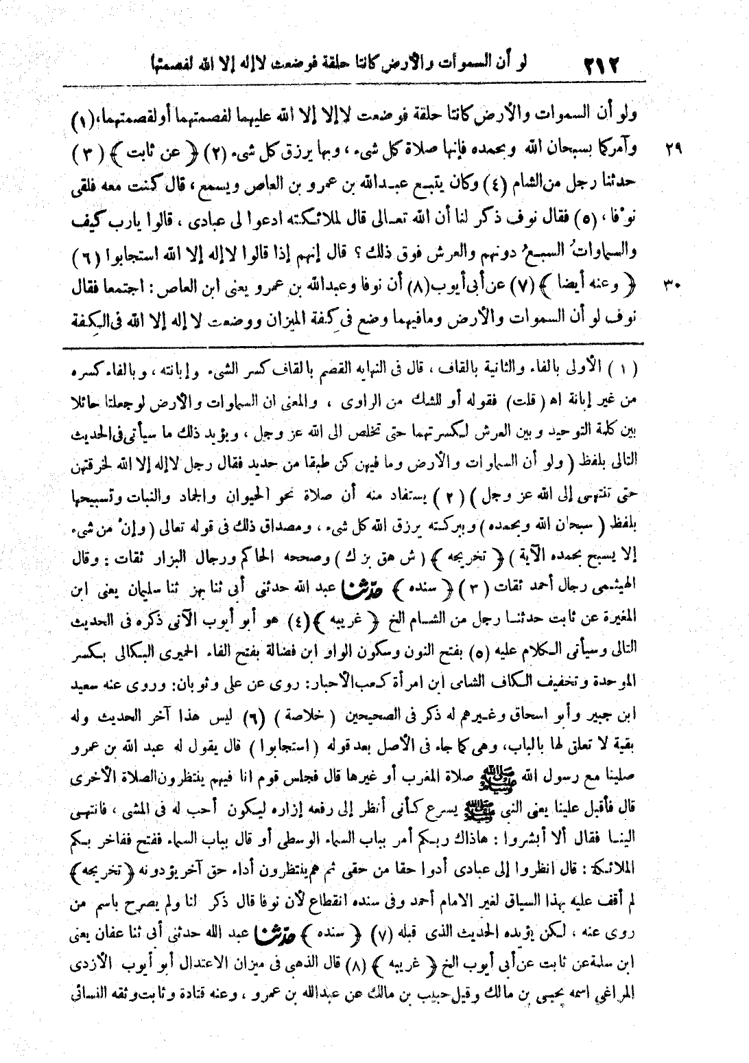ولو أن السماوات والأرض كانتا حلقة فوضعت لا إله إلا الله عليها لقصمتها، وآمركما بسبحان الله وبحمده فإنها صلاة كل شيء، وبها يرزق كل شيء (عن ثابت حدثنا رجل من الشام وكان يتبع عبد الله بن عمرو بن العاص ويسمع، قال كنت معه فلقي نوفا، فقال نوف ذكر لنا أن الله تعالى قال لملائكته ادعوا لي عبادي، قالوا يا رب كيف والسماوات السبع دونهم والعرش فوق ذلك؟ قال إنهم؟ إذا قالوا لا إله إلا الله استجابوا (وعنه أيضا) عن أبي أيوب أن نوفا وعبد الله بن عمرو ابن العاص: اجتمعا فقال نوف لو أن السموات والأرض وما فيهما وضع في كفة الميزان ووضعت لا إله إلا الله في الكفة