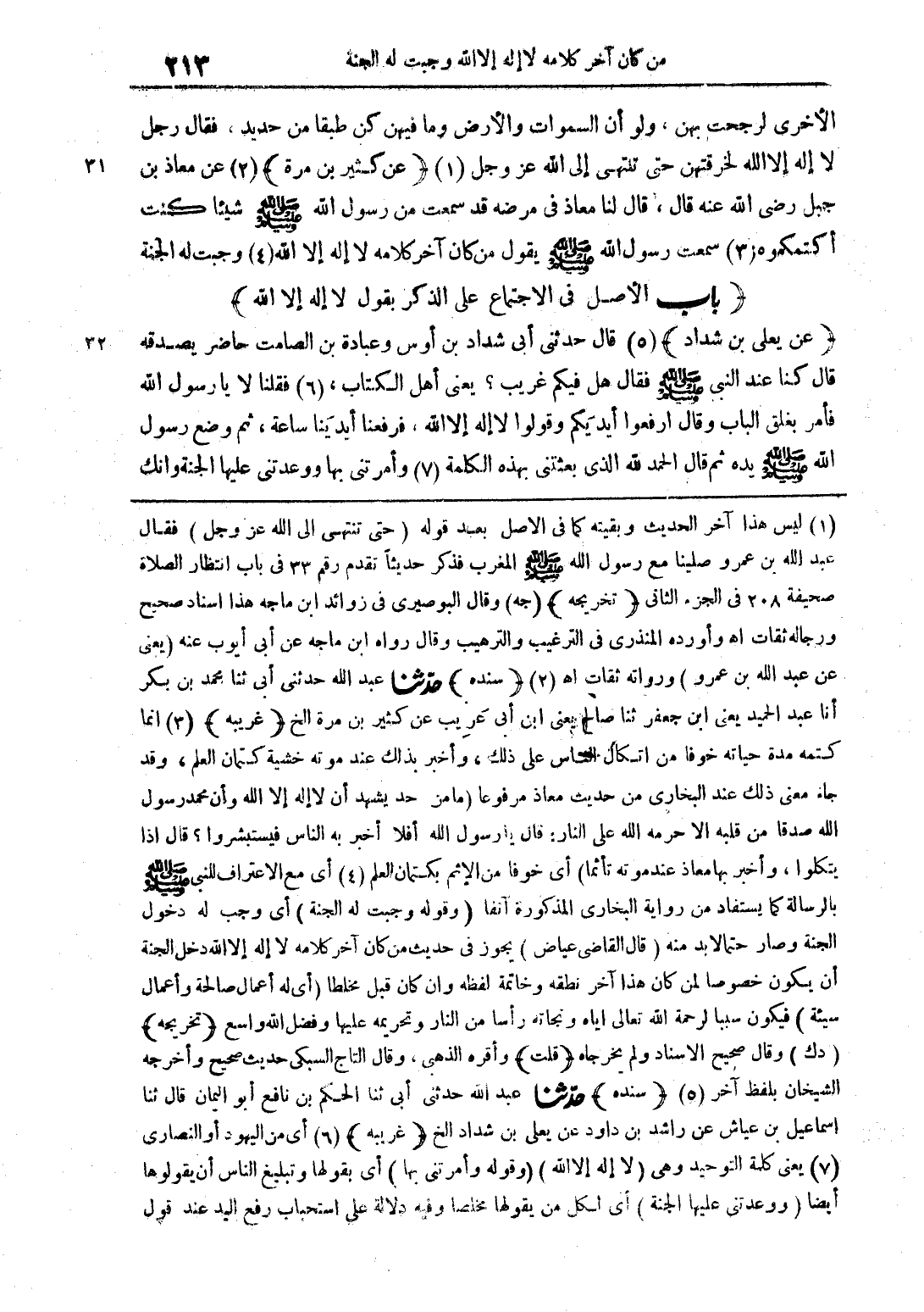 ليس هذا آخر الحديث وبقيته كما في الأصل بعد قوله (حتى تنتهي إلى الله عز وجل) فقال عبد الله بن عمرو صلينا مع رسول الله صلى الله عليه وسلم المغرب فذكر حديثا تقدم رقم 33 في باب انتظار الصلاة صحيفة 208 في الجزء الثاني (تخريجه) (جه) وقال البوصري في زوائد ابن ماجة هذا إسناد صحيح ورجاله ثقات وأورد هي المنذري في الترغيب والترهيب وقال رواه ابن ماجة عن أبي أيوب عنه (يعني عن عبد الحميد يعني ابن جعفر ثنا صالح يعني ابن أبي غريب عن كثير بن مرة الخ (غريبة) إنما كتمه مدة حياته خوفا من اتكال الناس على ذلك، وأخبر بذلك عند موته خشية كتمان العلم، وقد جاء معنى ذلك عند البخاري من حديث معاذ مرفوعا (ما من حد يشهد أن لا اله إلا الله وأن محمدا رسول الله صلى الله عليه وسلم صدقا من قلبه إلا حرم الله على النار، قال يا رسول الله أفلا أخبر به الناس فيستبشروا؟ قال إذا يتكلوا، وأخبر بها معاذ عند موته تأثما) أي خوفا من الإثم بالكتمان العلم أي مع الاعتراف للنبي صلى الله عليه وسلم بالرسالة كما يستفاد من رواية البخاري المذكرة آنفا (وقوله وجبت له الجنة) أي وجب له دخول الجنة وصار حتما لا بد منه (قال القاضي عياض) يجوز في حديث من كان آخر كلامه لا اله إلا الله دخل الجنة أن يكون خصوصا لمن كان هذا آخر نطقه وخاتمة لفظه وإن كان قبل مخلطا (أي له أعمال صالحة وأعمال سيئة) فيكون سببا لرحمة الله تعالى إياه ونجاته رأسا من النار وتحريم عليها وفضل الله واسع (تخريجه) (د ك) وقال الصحيح الإسناد ولم يخرجاه (قلت) وأقره الذهبي، وقال التاج السبكي حديث صحيح وأخرجه الشيخان بلفظ آخر (سنده) حدثنا عبد الله حدثني أبي ثنا الحكم بن نافع أبو اليمان قال ثنا إسماعيل بن عياش عن راشد ين داود عن يعلى بن شداد الخ (غريبة) أي من اليهود أو النصارى يعني كلمة التوحيد وهي (لا اله إلا الله) (وقوله وأمرتني بها) أي يقولها وتبليغ الناس أن يقولوها أيضا (ووعدتني عليها الجنة) أي لكل من يقولها مخلصا وفيه دلالة على استحباب رفع اليد عند قول