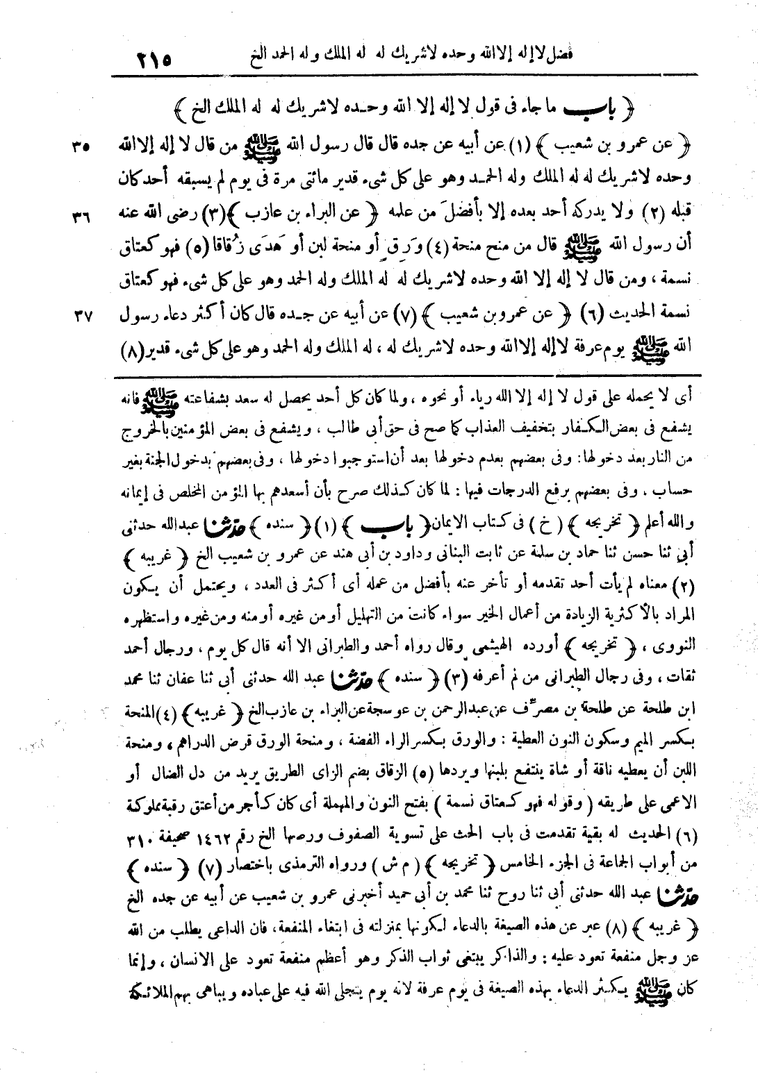 (عن عمرو بن شعيب) عن أبيه عن جده قال: قال رسول الله صلى الله عليه وسلم من قال لا اله إلا الله وحده لا شريك له الملك وله الحمد وهو على كل شيء قدير مائتي مرة في يوم لم يسبقه أحد كان قبله ولا يدركه أحد بعده إلا بأفضل من علمه (عن البراء بن عازب) رضي الله عنه أن رسول الله صلى الله عليه وسلم قال من منح منحة ورق أو منحة لبن أو هدى زقاقا فهو كعتاق نسمة، ومن قال لا اله إلا الله وحده لا شريك له الملك وله الحمد وهو على كل شيء قدير فهو كعتاق نسمة الحديث (عن عمرو بن شعيب) عن أبيه عن جده قال كان أكثر دعاء رسول الله صلى الله عليه وسلم يوم عرفة لا اله إلا الله وحده لا شريك له، الملك وله الحمد وهو على كل شيء قدير