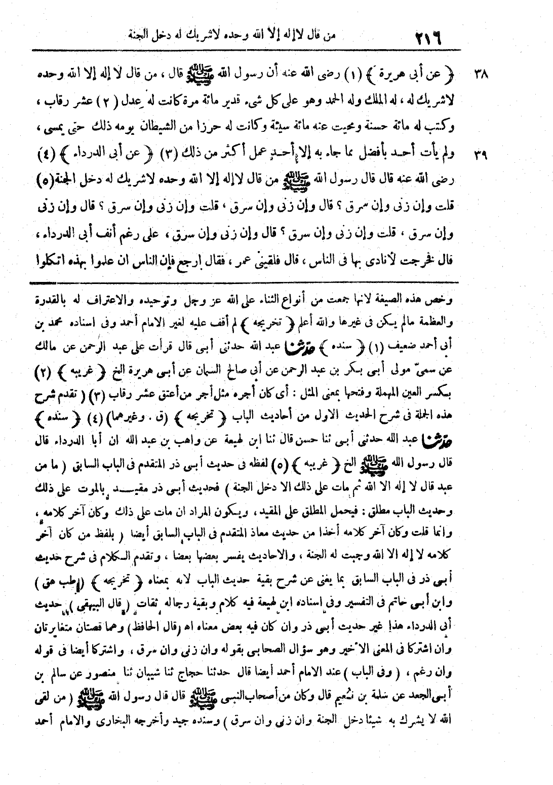 (عن أبي هريرة) رضي الله عنه أن رسول الله صلى الله عليه وسلم قال، من قال لا اله إلا الله وحده لا شريك له، له الملك وله الحمد وهو على كل شيء قدير مائتي مرة كانت له عدل عشر رقاب، وكتب له مائة حسنة وحيت عنه مائة سيئة وكانت له حرزا من الشيطان يومه ذلك حتى يمسي، ولم يأت أحد بأفضل مما جاء به إلا أحد عمل أكثر نمن ذلك (عن أبي الدرداء) رضي الله عنه قال: قال رسول الله صلى الله عليه وسلم من قال لا اله إلا الله وحده لا شريك له دخل الجنة قلت وإن زنى وإن سرق؟ قال وإن زنى وإن سرق، قلت وإن زنى وإن سرق؟ قال وإن زنى وإن سرق، قلت وإن زنى وإن سرق؟ قال وإن زنى وإن سرق، على رغم أنف أبي الدرداء، قال فخرجت لأنادي بها في الناس، قال فلقيني عمر، فقال ارجع فإن الناس إن علموا بهذه اتكلوا
