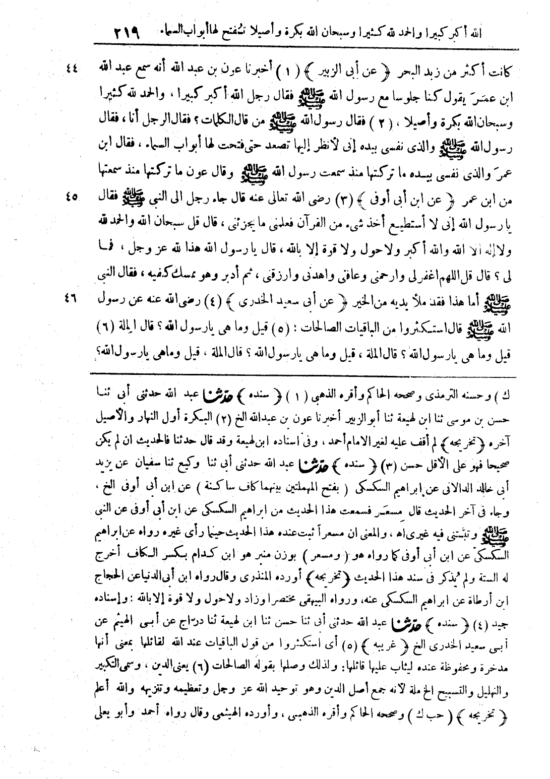 كانت أكثر من زبد البحر (عن أبي الزبير) أخبرنا عون بن عبد الله أنه سمع عبد الله ابن عمر يقول كنا جلوسا مع رسول الله صلى الله عليه وسلم فقال رجل أكبر كبيرا، والحمد لله كثيرا وسبحان الله بكرة وأصيلا، فقال رسول الله صلى الله عليه وسلم وقال عون ما تركتها منذ سمعتها من ابن عمر (عن ابن أبي أوفى) رضي الله تعالى عنه قال جاء رجل إلى النبي صلى الله عليه وسلم فقال يا رسول الله إني لا أستطيع أخذ شيء من القرآن فعلمني ما يجزئني، قال قل سبحان الله والحمد لله ولا اله إلا الله والله أكبر ولا حول ولا قوة إلا بالله، قال يا رسول الله عز وجل، فما لي؟ قال قل اللهم اغفر لي وارحمني وعافني واهدني وارقني، ثم أدبر وهو ممسك كفيه، فقال النبي صلى الله عليه وسلم أما ها فقد ملأ يديه من الخير (عن أبي سعيد الخدري) رضي الله عنه عن رسول الله صلى الله عليه وسلم قال استكثروا من الباقيات الصالحات، قيل وما هي يا رسول الله؟ قال الملة قيل وما هي يا رسول الله؟ قال الملة، قيل وما هي يا رسول الله؟ قال الملة، قيل وما هي يا رسول الله؟