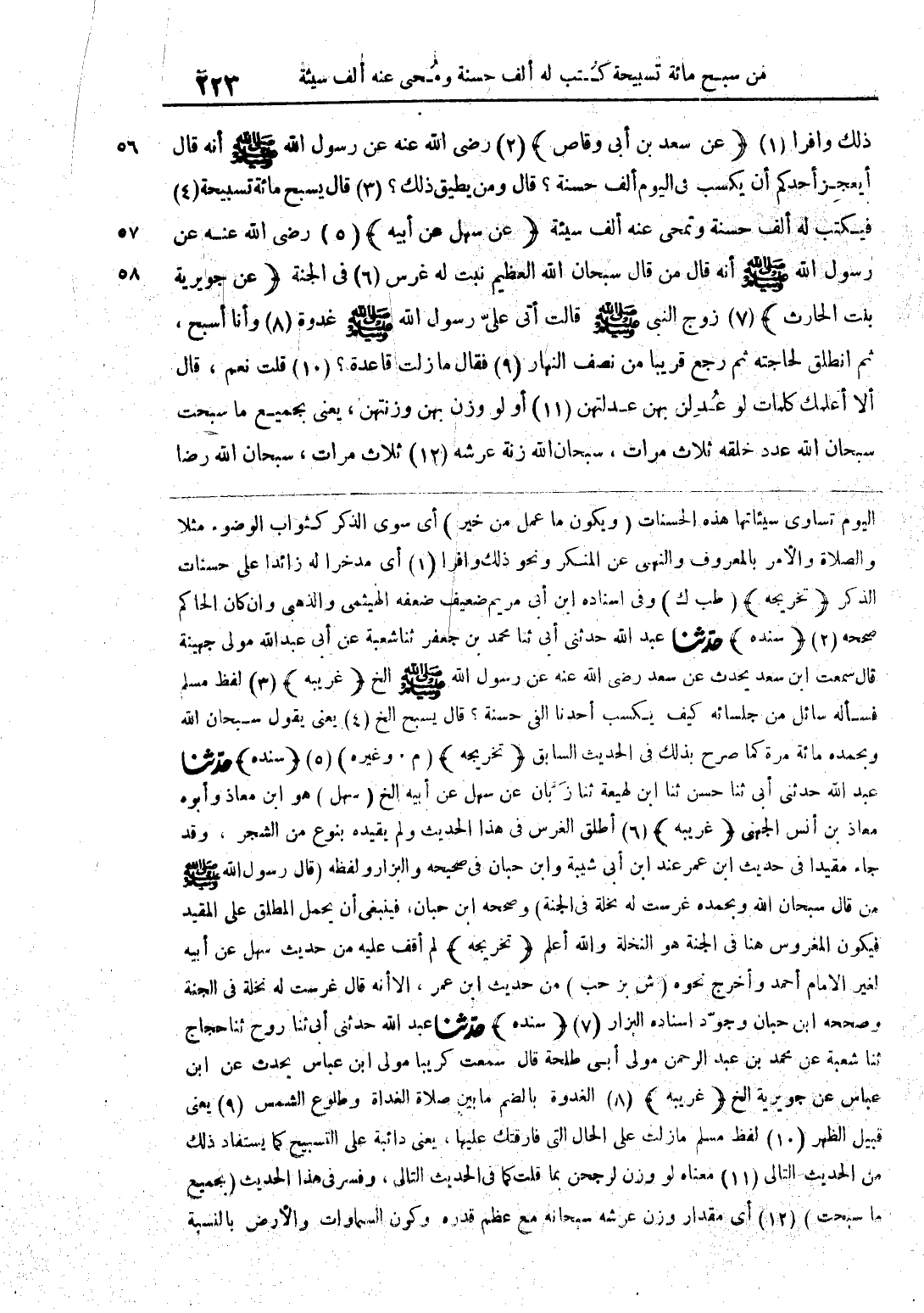 ذلك وافرا (عن سعد بن أبي وقاص) رضي الله عنه عن رسول الله صلى الله عليه وسلم أنه قال أيعجز أحدكم أن يكسب في اليوم ألف حسنة؟ قال ومن يطيق ذلك؟ قال يسبح مائة تسبيحة فيكتب له ألفي حسنة وتمحى عنه ألف سيئة (عن سهل عن أبيه) رضي الله عنه عن رسول الله صلى الله عليه وسلم أنه قال من قال سبحان الله العظيم نبت له غرس في الجنة (عن جويرية بنت الحارث) زوج النبي صلى الله عليه وسلم قالت أتى على رسول الله صلى الله عليه وسلم غدوة وأنا أسبح، ثم انطلق لحاجته ثم رجع قريبا من نصف النهار فقال ما زلت قاعدة؟ قلت نعم، قال ألا أعلمك كلمات لو عدلن بهن عدلتهن أو لو وزن بهن وزنتهن، يعني بجميع ما سبحت سبحان الله عدد خلقه ثلاث مرات، سبحان الله زنة عرشه ثلاث مرات، سبحان الله رضا
