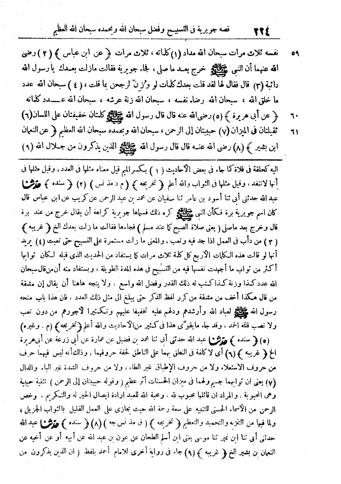 نفسه ثلاث مرات سبحان الله مداد كلماته، ثلاث مرات (عن ابن عباس) رضي الله عنهما أن النبي صلى الله عليه وسلم خرج بعد ما صلى، فجاء جويرية فقالت ما زلت بعدك يا رسول الله دائبة قال فقال لها قلت بعدك كلمات لو وزن لرجحن بما قلت، سبحان الله عدد ما خلق الله، سبحان الله رضاء نفسنه، سبحان الله زنة عرشه، سبحان الله عدد كلماته (عن أبي هريرة) رضي الله عنه قال: قال رسول الله صلى الله عليه وسلم كلمتان خفيفتان على اللسان ثقيلتان في الميزان حبيبتان إلى الرحمن، سبحان الله وبحمده سبحان الله العظيم (عن النعمان ابن بشير) رضي الله عنه قال: قال رسول الله صلى الله عليه وسلم الذين من جلال الله
