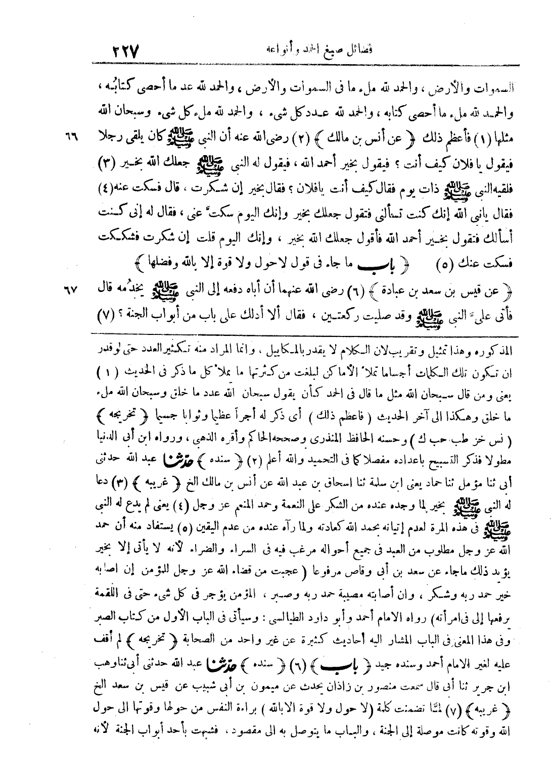 السماوات والأرض، والحمد لله ملء ما في السماوات والأرض، والحمد لله عدد ما أحصى كتبه، والحمد لله ملء ما أحصى كتابه، والحمد لله عدد كل شيء، والحمد لله ملء كل شيء وسبحان الله مثلها فأعظم ذلك (عن أنس بن مالك) رضي الله عنه أن النبي صلى الله عليه وسلم قال كان يلقلى الرجل فيقول يا فلان كيف أنت؟ فيقول بخير أحمد الله، فيقول له النبي صلى الله عليه وسلم جعلك الله بخير فلقيه النبي صلى الله عليه وسلم ذات يوم فقال كيف أنت يا فلان؟ فقال بخير؟ إن شكرت، قال فسكت عنه فقال يا نبي الله إنك كنت تسألني فتقول جعلك بخير وإنك اليوم سكت عني، فقال له إني كنت أسألك فتقول بخير أحمد الله فأقول جعلك الله بخير، وإنك اليوم قلت إن شكرت فشككت فسكت عنك (باب ما جاء في قول لا حول ولا قوة إلا بالله وفضلها)