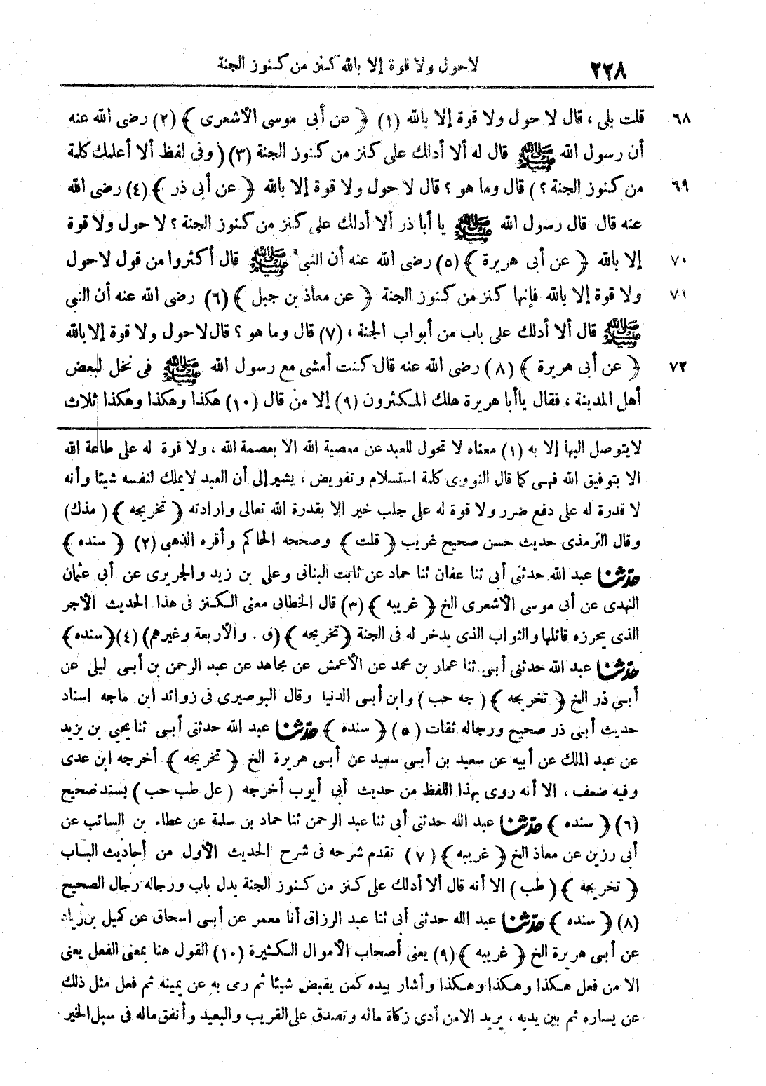 لا يتوصل إليها إلا به معناه لا تحول للعبد عن معصية الله إلا بعصمة الله، ولا قوة له على طاعة الله إلا بتوفيق الله فهي كما قال النووي كلمة استسلام وتفويض، يضير إلى أن العبد لا يملك لنفسه شيئا وأنه لا قدرة له على دفع ضرر ولا قوة له على جلب خير إلا بقدرة الله تعالى وإرادته (تخريجه) (مذ ك) وقال الترمذي حديث حسن صحيح غريب (قلت) وصححه الحاكم وأقره الذهبي (سنده) حدثنا عبد الله حدثني أبي ثنا عفان ثنا حماد عن ثابت البناني وعلي ابن زيد والجريري عن أبي عثمان النهدي عن أبي موسى الأشعري الخ (غريبة) قال الخطابي معنى الكنز في هذا الحديث الأجر الذي يحرزه قائلا والثواب الذي يدخر له الجنة (تخريجه) (ق. والأربعة وغيرهم) (سنده) حدثنا عبد الله أبي ثنا عمار بن محمد عن الأعمش عن مجاهد عن الرحمن بن أبي ليلى عن أبي ذر صحيح ورجاله ثقات (سنده) حدثنا عبد الله حدثني أبي ثنا يحيى يزيد عن عبد الملك عن أبيه عن سعيد عن أبي هريرة الخ (تخريجه) أخرجه ابن عدي وفيه ضعف، إلا أنه روى بهذا اللفظ من حديث أبي أيوب أخرجه (عل طب حب) بسند صحيح (سنده) حدثنا عبد الله حدثني أبي ثنا عبد الرحمن ثنا حماد بن سلمة عن عطاء بن السائب عن أبي رزين عن معاذ الخ (غريبة) تقدم شرحه في شرح الحديث أول من أحاديث الباب (تخريجه) (طب) إلا أنه قال ألا أدلك على مكنز من كنوز الجنة بدل باب ورجاله رجال الصحيح (سنده) حدثنا عبد الله حدثني أبي ثنا عبد الرزاق أنا معمر عن أبي إسحاق عن كميل بن زياد عن أبي هريرة الخ (غريبة) يعني أصحاب الأموال الكثيرة القول هنا بمعنى الفعل يعني إلا من فعل هكذا وهكذا وهكذا وأشار بيده كمن يقبض شيئا ثم رمى به عن يمينه ثم فعل مثل ذلك عن يساره ثم بين يديه، يريد إلا من أدى زكاة ماله وتصدق على القريب والبعيد وأنفق ماله في سبل الخير