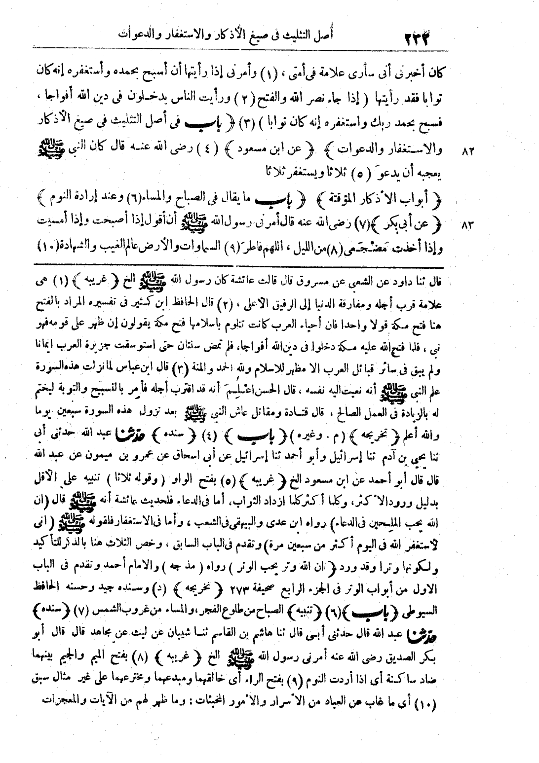 كان أخبرني أني سأرى علامة في أمتي، وأمرني إذا رأيتها |أن أسبح بحمده وأستغفره إنه كان توابا فقد رأيتها (إذا جاء نصر الله والفتح ورأت الناس يدخلون في دين الله أفراجا، فسبح بحمد ربك واستغفره إنه كان توابا) (باب في أصل التثليث في صيغ الأذكار والاستغفار والدعوات) (عن ابن مسعود) رضي الله عنه قال كان النبي صلى الله عليه وسلم يعجبه أن يدعو ثلاثا ويستغفر ثلاثا