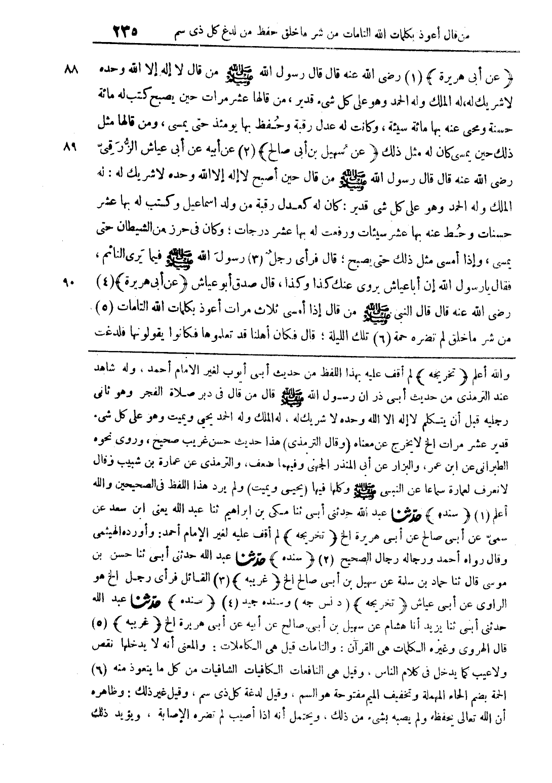 (عن أبي هريرة) رضي الله عنه قال: قال النبي صلى الله عليه وسلم: من قال إذا أمسى ثلاث مرات أعوذ بكلمات الله التامات من شر ما خلق لم تضره حمة تلك الليلة؛ قال فكان أهلنا قد تعلموها فكانوا يقولونها فلدغت