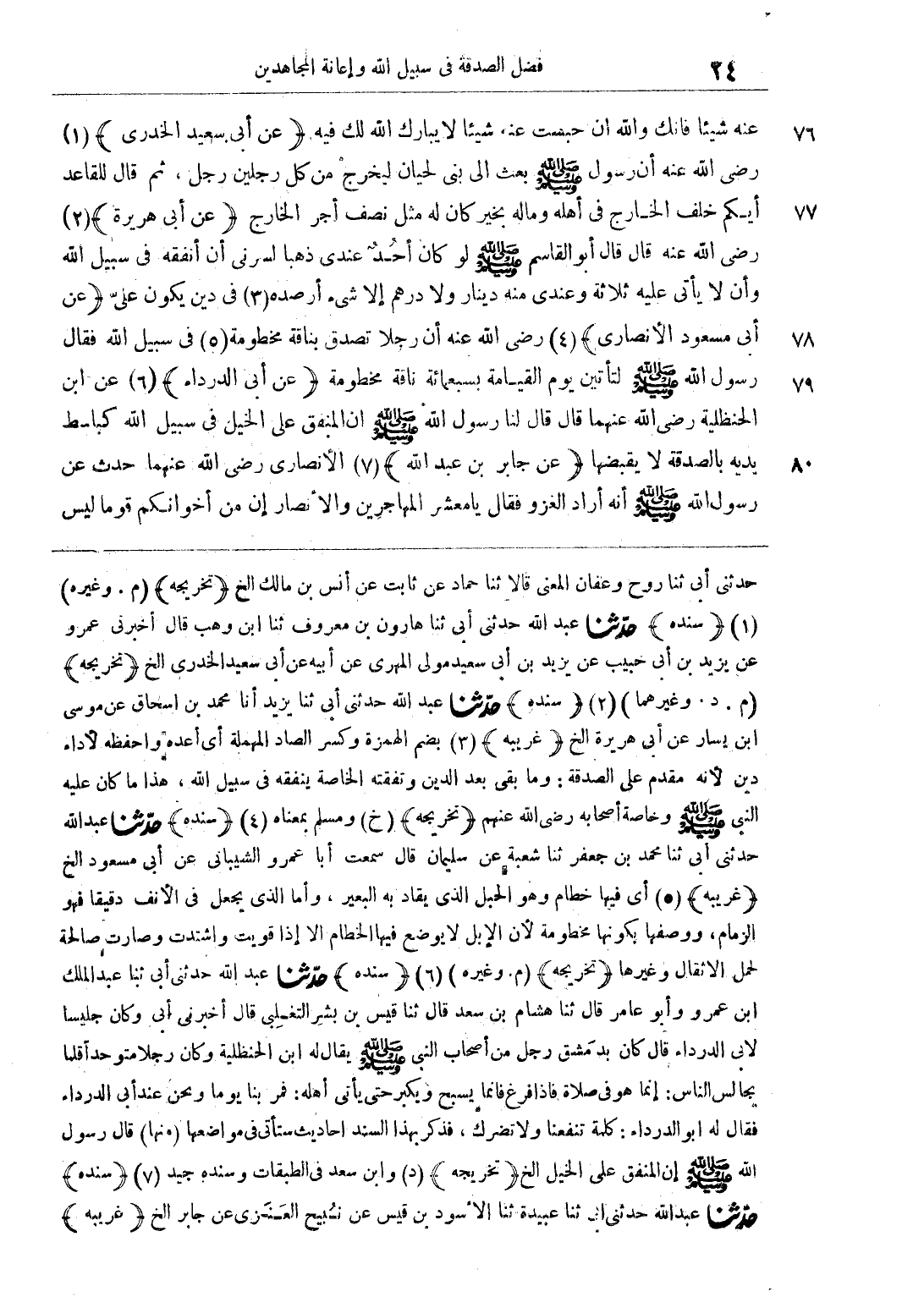 عنه شيئا فإنك والله إن حبست عنه شيئا لا يبارك الله لك فيه (عن أبي سعيد الخدري) رضي الله عنه أن رسول الله صلى الله عليه وسلم بعث إلى بني لحيان ليخرج من كل رجلين رجل، ثم قال للقاعد أيكم خلف الخارج في أهله وماله بخير كان له مث 3 ل نصف أجر الخارج (عن أبي هريرة) رضي الله عنه قال: قال أبو القاسم صلى الله عليه وسلم لو كان أحد عندي ذهبا لسرني أن أنفقه في سبيل الله وأن لا يأتي عليه ثلاثة وعندي منه دينار ولا درهم إلا شيء أرصده في دين يكون على (عن أبي مسعود الأنصاري) رضي الله عنه أن رجلا تصدق بناقة مخطومة في سبيل الله فقال رسول الله صلى الله عليه وسلم لتأتين يوم القيامة بسبعمائة ناقة مخطومة (عن أبي الدرداء) عن ابن الحنظلية رضي الله عنهما قال: قال لنا رسول الله صلى الله عليه وسلم إن المنفق على الخيل في سبيل الله كباسط يديه بالصدقة لا يقبضها (عن جابر بن عبد الله) الأنصاري رضي الله عنهما حدث عن رسول الله صلى الله عليه وسلم أنه أراد الغزو فقال يا معشر المهاجرين والأنصار إن من إخوانكم قوما ليس