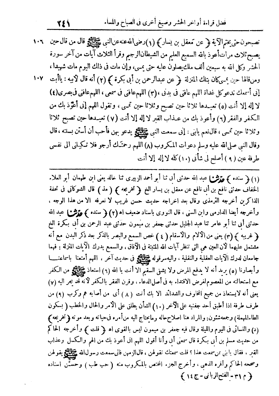(سنده) حدثنا عبد الله حدثني أبي ثنا أبو أحمد الزبيري ثنا خالد يعني ابن طهمان أبو العلاء الخفاف حدثني نافع بن أبي نافع عن معقل بن يسار الخ (تخريجه) (مذ) قال الشوكاني في تحفة الذاكرين أخرجه الترمذي وقال بعد إخراجه حديث حسن غريب لا نعرفه إلا من هذا الوجه، وأخرجه أيضاً الدارمي وابن السني، قال النووي بإسناد ضعيف اهـ. (سنده) حدثنا عبد الله حدثني أبي ثنا أبو عامر ثنا عبد الجليل حدثني جعفر بن ميمون حدثني عبد الرحمن بن أبي بكرة الخ (غريبة). يعني من الآلام والأسقام. خص السمع والبصر بالذكر بعد ذكر البدن مع أنه مشتمل عليهما لأن العين هي التي تنظر آيات الله المثبتة في الآفاق، والسمع يدرك الآيات المنزلة: فهما جامعان لدرك الآيات العقلية والنقلية، وغليه سر قوله صلى الله عليه وسلم في حديث آخر، اللهم أمتعنا بأسماعنا وأبصارنا. يريد أنه لا يدفع المرض ولا يشفي السقيم إلا أنت يا الله. استعاذ صلى الله عليه وسلم من الكفر مع استحالته من المعصوم لغرض الاقتداء به في أصل الدعاء، وقرن الفقر بالكفر لأنه قد يجر غليه. يعني أنه لا يستعاذ من جميع المخاوف والشدائد إلا بك أنت. أي من أصابه هم وكرب. من طرف طرفة إذا أطبق أحد جفنيه على الآخر. الشأن يطلق على الأمر والحال واخطب (بسكون الطاء المهملة) وجمعه شئون: والمراد هنا إصلاح حاله وما يحتاج إليه من أمره في حياته وبعد موته (تخريجه) (د) والنسائي في اليوم والليلة وقال فيه جعفر بن ميمون ليس بالقوي اهـ (قلت) وأخرجه الحاكم م حديث مسلم بن أبي بكرة قال سمعني أبي وأنا أقول اللهم إني أعوذ بك من الهم والكسل وعذاب القبر، فقال يا بني ممن سمعت هذا؟ قلت سمعتك تقولهن، قال الزمهن فإني سمعت رسول الله صلى الله عليه وسلم يقولهن وصححه الحاكم وأقره الذهبي، وأخرج الجزء المختص بالمكروب منه (حب طب) وحسن إسناده