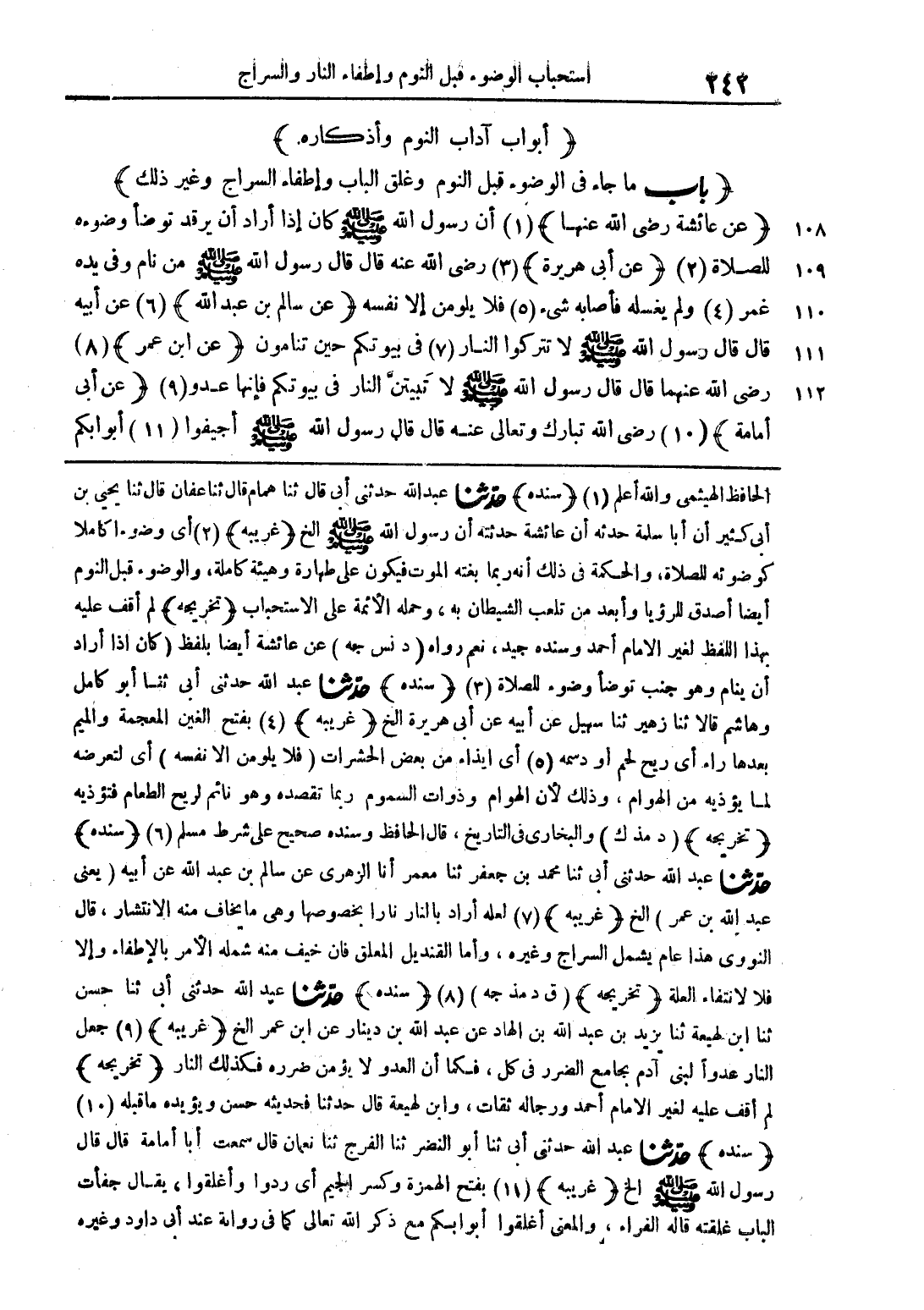 111 - (عن ابن عمر) رضي الله عنهما قال: قال رسول الله صلى الله عليه وسلم: لا تبيتن النار في بيوتكم فإنها عدو.