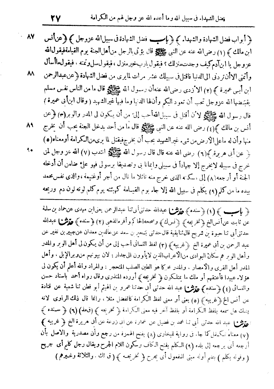 (أبوب فضل الشهادة والشهداء) (باب فضل الشهادة في سبيل الله عز وجل) (عن أنس ابن مالك) رضي الله عنه عن النبي صلى الله عليه وسلم قال يؤتى بالرجل من أهل الجنة يوم القيامة فيقول الله عز وجل يا ابن آدم كيف وجدت منزلك؟ فيقول يا رب خير منزل، فيقول سل وثمنه، فيقول ما أسأل وأتمنى إلا أن تردني إلى الدنيا فاقتل في سبيلك عشر مرات لما يرى من فضل الشهادة (عن عبد الرحمن ابن أبي عميرة) الأزدي رضي الله عنه أن رسول الله صلى الله عليه وسلم قال ما من الناس نفس مسلم يقبضها الله عز وجل تحب أن تعود إليكم وأن لها الدنيا وما فيها غير الشهيد (وقال ابن أبي عميرة) قال رسول الله صلى الله عليه وسلم لأن أقتل في سبيل الله أحب إلى من أن يكون لي المدر والوبر (عن أنس بن مالك) رضي الله عنه عن النبي صلى الله عليه وسلم قال ما من أحد يدخل الجنة يحب أن يخرج منها وأن له ما على الأرض من شيء غير الشهيد يحب أن يخرج فيقتل لما يرى من الكرامة أو معناه (عن أبي هريرة) رضي الله عنه قال: قال رسول الله صلى الله عليه وسلم انتدب الله عز وجل لمن خرج في سبيل الله لا يخرج إلا جهادا في سبيلي وإيمانا بي وتصديقا برسولي فهو على ضامن أن أدخله الجنة أو أرجعه إلى مسكنه الذي خرج منه نائلا ما نال من أجر أو غنيمة، والذي نفس محمد بيده ما من كلم يكلم في سبيل الله إلا جاء يوم القيامة كهيئته يوم كلم لونه لون دم وريحه