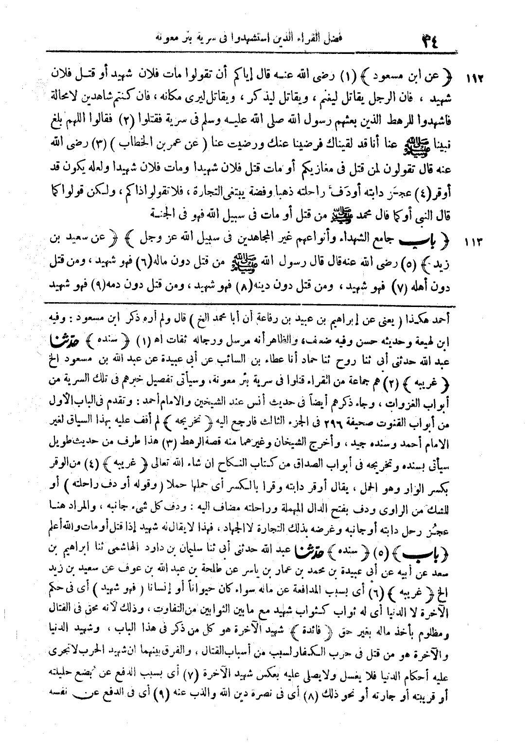 أحمد هكذا (يعني عن ابراهيم عن عبيد بن رفاعة أن أبا محمد الخ) قال ولم أره ذكر ابن مسعود: وفيه ابن لهيعة وحديثه حسن وفيه ضعف، والظاهر أنه مرسل ورجاله ثقات اهـ سنده) حدثنا عبد الله حدثني أبي ثنا روح ثنا حماد أنا عطاء بن السائب عن أبي عبيدة عن عبد الله بن مسعود الخ (غريبة) هم جماعة من القراء قتلوا في سرية بئر معونة، وسيأتي تفصيل خبرهم في تلك السرية من أبواب الغزوات، وجاء ذكرهم أيضا في حديث أنس عند الشيخين والإمام أحمد: وتقدم في الباب الأول من أبواب القنوت صحيفة 296 في الجزء الثالث فارجع إليه (تخريجه) لم أقف عليه بهذا السياق لغير الإمام أحمد وسنده جيد، وأخرج الشيخان وغيرهما منه قصة الرهط هذا طرف من حديث طويل سيأتي بسنده وتخريجه في أبواب الصداق من كتاب النكاح إن شاء الله تعالى (غريبة) من الوقر بكسر الواو وهو الحمل، يقال أوقر دابته وقرا بالكسر أي حملها حملا (وقوله أودف راحلته) أو للشك من الزاوي ودف بفتح الدال المهملة وراحلته مضاف إليه: ودف كل شيء جانبه، والمراد هنا عجز رحل دابته أو جانبه وغرضه بذلك التجارة لا الجهاد، فهذا لا يقال له شهيد إذا قتل أو مات والله أعلم
