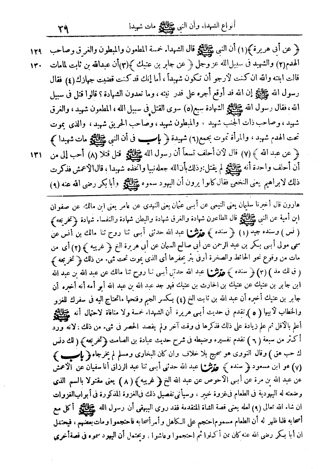 (عن أبي هريرة) رضي الله عنه أن النبي صلى الله عليه وسلم قال الشهداء خمسة المطعون والمبطون والغرق وصاحب الهدم والشهيد في سبيل الله عز وجل (عن جابر بن عتيك) أن عبد الله بن ثابت لما مات قالت ابنته والله إن كنت لأرجوا أن تكون شهيدا، أما إنك قد كنت قضيت جهازك فقال رسول الله صلى الله عليه وسلم إن الله أوقع أجره على قدر نيته، وما تعدون الشهادة؟ قالوا قتل في سبيل الله، فقال رسول الله صلى الله عليه وسلم الشهادة سبع سوى القتل في سبيل الله، المطعون شهيد، والغرق شهيد، وصاحب ذات الجنب شهيد، والمبطون شهيد، وصاحب الحريق شهيد، والذي يموت تحت الهدم شهيد، والمرأة تموت بجمع شهيدة (باب في أن النبي صلى الله عليه وسلم مات شهيدا)