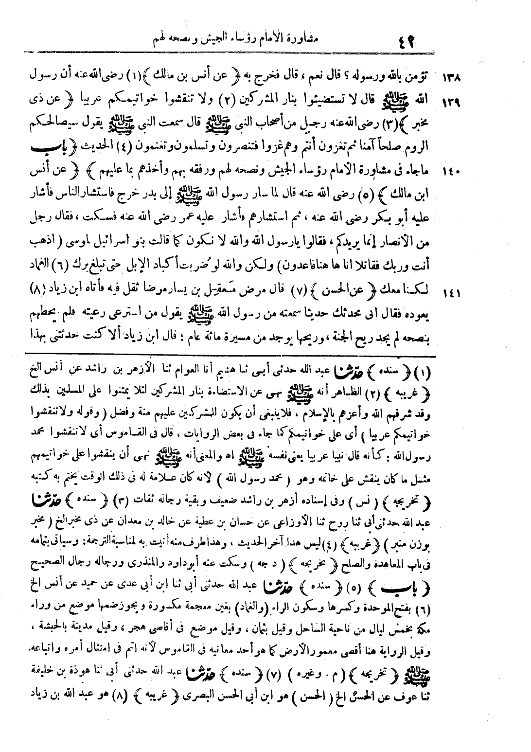 تؤمن بالله ورسوله؟ قال نعم، قال فخرج به (عن أنس بن مالك) رضي الله عنه أن رسول الله صلى الله عليه وسلم قال لا تستضيئوا بنار المشركين ولا تنقشوا خواتيمكم عربيا (عن ذي مخبر) رضي الله عنه رجل من أصحاب النبي صلى الله عليه وسلم قال سمعت النبي صلى الله عليه وسلم يقول سيصالحكم الروم صلحا آمنا ثم تغزون أنتم وهم غزوا فتنصرون وتسلمون وتغنمون الحديث (باب ما جاء في مشاورة الإمام رؤساء الجيش ونصحه ورفقه بهم وأخذهم بما عليهم) (عن أنس ابن مالك) رضي الله عنه قال: قال لما سار رسول الله صلى الله عليه وسلم إلى بدر خرج فاستشار الناس فأشار عليه أبو بكر رضي الله عنه، ثم استشارهم فأشار عليه عمر رضي الله عنه فسكت، فقال رجل من الأنصار إنما يريدكن، فقالوا يا رسول الله والله لا نكون كما قالت بنو إسرائيل لموسى (اذهب أنت وربك فقاتلا إنا هنا قاعدون) ولكن والله لو ضربت أكباد الإبل حتى تبلغ برك الغمام لكنا معك (عن الحسن) قاتل مرض معقل بن يسار مرضا ثقل فيه فأتاه ابن زياد يعوده فقال أبيس محدثك حديثا سمعته من رسول الله صلى الله عليه وسلم يقول من استرعى رعيته فلم يحطم بنصحه لم يجد ريح الجنة، وريحها يوجد من مسيرة مائة عام، قال ابن زياد ألا كنت حدثني بهذا