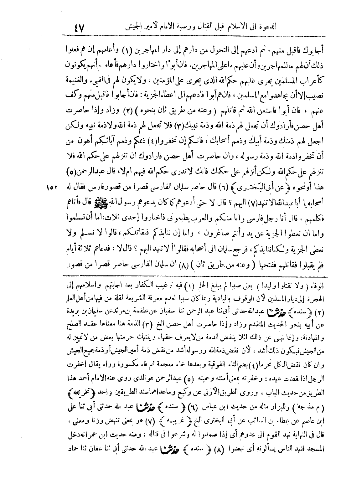 أجابوك فاقبل منهم، ثم ادعهم إلى التحول من دارهم إلى دار المهاجرين وأعلمهم إن هم فعلوا ذلك أن لهم ما للمهاجرين وأن عليهم ما على المهاجرين، فإن أبوا واختاروا دارهم فاعلموا أنهم يكونون كالأعراب المسلمين يجري عليهم حكم الله الذي يجري على المؤمنين، ولا يكون لهم في الفيء والغنيمة نصيب إلا أن يجاهدوا مع المسلمين، فإن هم أبوا فادعهم إلى إعطاء الجزية: فإن أجابوا فأقبل منهم وكف عنهم، فإن أبوا فاستعن الله ثم قاتلهم (وعنه من طريق ثان بنحوه) وزاد وإذا حاصرت أهل حصن فأرادوك أن تجعل لهم ذمة الله وذمة نبيك فلا تجعل لهم ذمة الله ولا ذمة نبيه ولكن أجعل لهم ذمتك أبيك وذمم أصحابك، فإنكم إن تخفروا ذممكم وذمم آبائكم أهون من أن تخفروا ذمة الله وذمة رسوله، وان حاصرت أهل حصن فأرادوك أن تنزلهم على حكم الله فلا تنزلهم على حكم الله ولكن أنزلهم على حكمك فإنك لا تدري حكم الله فيهم أم لا، قال عبد الرحمن هذا أو نحوه (عن أبي البختري) قال حاصر سليمان الفارسي قصرا من قصور فارس فقال له أصحابه يا أبا عبد الله ألا تنهد إليهم؟ قال لا حتى أدعوهم كما كان يدعوهم رسول الله صلى الله عليه وسلم قال فأتاهم فكلمهم، قال أنا رجل فارسي وأنا منكم والعرب يطيعوني فاختاروا إحدى ثلاث: أما أن تسلموا وإما أن تعطوا الجزية عن يد وأنتم صاغرون، وإما إن ننابذكم فنقاتلكم، قالوا لا نسلم ولا نعطي الجزية ولكنا ننابذكم، فرجع سليمان إلى أصحابه فقالوا ألا تنهد إليهم؟ قال لا، فدعاهم ثلاثة أيام فلم يقبلوا فقاتلهم ففتحها (وعنه من طريق ثان) أن سلمان الفارسي حاصر قصرا من قصور