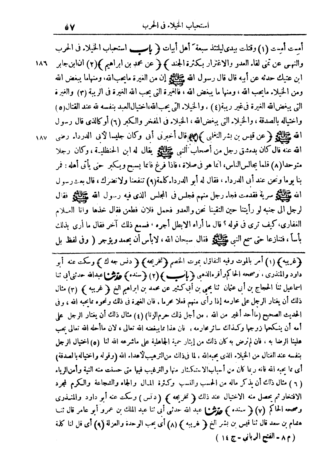 أمت أمت وقلت بيدي ليلة إذ سبعة أهل أبيات (باب استحباب الخيلاء في الحرب والنهي عن تمني لقاء العدو والاغتراء بكثرة الجند) (عن محمد بن إبراهيم) أن ابن جابر ابن عتيك حدثه عن أبيه قال: قال رسول الله صلى الله عليه وسلم إن من الغيرة ما يحب الله، ومنها ما يبغض الله ومن الخيلاء ما يحب الله، ومنها ما يبغض الله، فالغيرة التي يحب الله الغيرة في الريبة والغيرة التي يبغض الله الغيرة في غيبة ريبة، والخيلاء التي يحب الله، اختيار العبد بنفسه لله عند القتال واختياله بالصدفة، والخبلاء التي يبغض الله، الخيلاء في المفخر والكبر أو كالذي قال رسول الله صلى الله عليه وسلم (عن قيس بن بشر التغلبي) قال أخبرني أبي وكان جليسا لأبي الدرداء رضي الله عنه قال كان بدمشق رجل من أصحاب النبي صلى الله عليه وسلم يقال له ابن الحنظلية، وكان رجلا متوحدا فلما قلما يجالس الناس، إنما هو في صلاة، ف'فإذا فرغ فغنما يسبح ويكبر حتى يأتي أهله: فمر بنا يوما ونحن عند أبي الدرداء، فقال له أبو الدرداء كلمة تنفعنا ولا تضرك، قال بعث رسول الله صلى الله عليه وسلم فقال لرجل إلى جنبه لو رأيتنا حين التقينا نحن والعدو فحمل فلان فطعن فقال خذها وأنا الغلام الغفاري، كيف ترى في قوله؟ قال ما أراه الأبطل أجره، فسمع ذلك آخر فقال ما أرى بذلك بأسا، فتنازعا حتى سمع النبي صلى الله عليه وسلم فقال سبحان، لا بأس أن يحمد ويؤجر (وفي لفظ بل