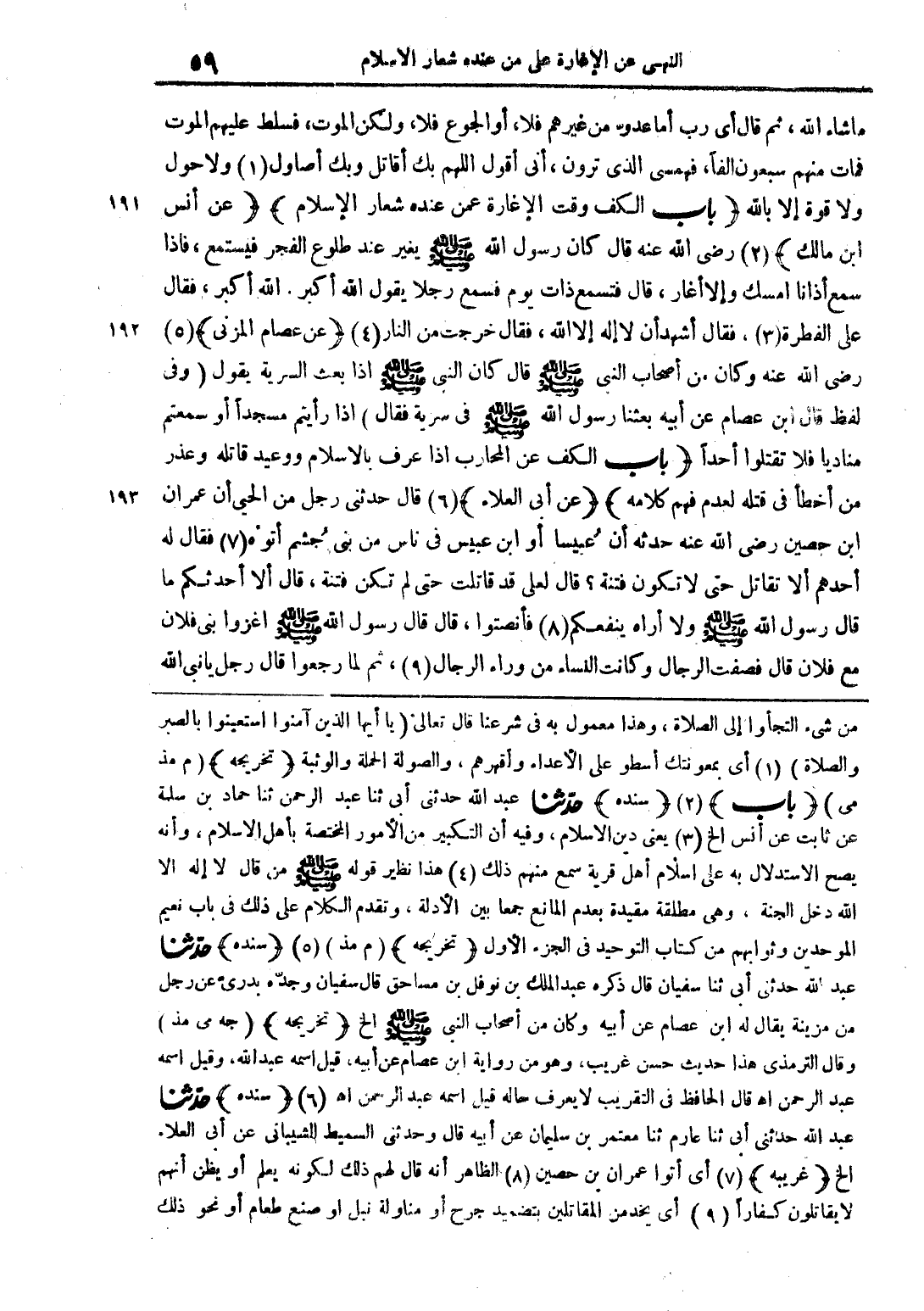 ما شاء الله، ثم قال أي رب أما عدو من غيرهم فلا، أو الجوع فلا، ولكن الموت، فسلط عليهم الموت فمات منهم سبعون ألفا، فهمسي الذي ترون، أني أقول اللهم بك أقاتل وبك أصاول ولا حول ولا قوة إلا بالله (باب الكف وقت الإغارة عمن عنده شعار الإسلام) (عن أنس ابن مالك) رضي الله عنه قال: قال رسول الله صلى الله عليه وسلم يغير عند طلوع الفجر فيستمع، فإذا سمع أذانا أمسك وإلا أغار، قال فتسمع ذات يوم فسمع رجلا يقول الله أكبر. الله أكبر، فقال على الفطرة، فقال أشهد أن لا إله إلا الله، فقال خرجت من النار (عن عصام المزني) رضي الله عنه وكان من أصحاب النبي صلى الله عليه وسلم قال كان النبي صلى الله عليه وسلم إذا بعث السرية يقول (وفي لفظ قال ابن عصام عن أبيه بعثنا رسول الله صلى الله عليه وسلم في سرية فقال) إذا رأيتم مسجدا أو سمعتم مناديا فلا تقتلوا أحدا (باب الكف عن المحارب إذا عرف بالإسلام ووعيد قاتله وعذر من خطأ في قتله لعدم فهم كلامه) (عن أبي العلا) قال حدثني رجل من الحي أن عمران ابن حصين رضي الله عنه حدثه أن عبيسا أو ابن عبيس في ناس من بني جشم أتوه فقال له أحدهم ألا تقاتل حتى لا تكون فتنة؟ قال لعلي قد قاتلت حتى لم تكن فتنة، قال ألا أحدثكم ما قال رسول الله صلى الله عليه وسلم ولا أراه ينفعكم فأنصتوا، قال: قال رسول الله صلى الله عليه وسلم اغزوا بني فلان مع فلان قال فصفت الرجال وكانت النساء من وراء الرجال، ثم لما رجعوا قال رجل يا نبي الله