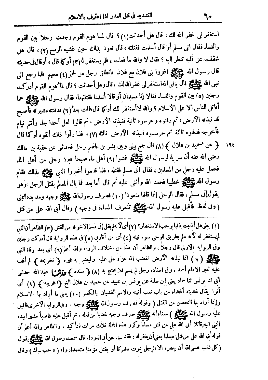استغفر لي غفر الله لك، قال هل أحدثت؟ قال لما هزم القوم وجدت رجلا بين القوم والنساء فقال إني مسلم أو قال أسلمت فقتلته، قال تعوذ بذلك حين غشيه الرمح، قال هل شققت عن قلبه تنظر إليه؟ فقال لا والله ما فعلت، فلم يستغفر له أو كما قال، أو قال في حديثه قال رسول الله صلى الله عليه وسلم اغزوا بني فلان مع فلان فانطلق رجل من لحمى معهم فلما رجع إلى نبي الله صلى الله عليه وسلم قال يا نبي الله استغفر لي غفر الله لك، قال وهل أحدثت؟ قال لما هزم القوم أدركت رجلين بين القوم والنساء فقالا أسلمنا فقتلتهما، فقال رسول الله صلى الله عليه وسلم عما أقاتل الناس إلا على الإسلام؟ والله لا أستغفر لك أو كما قال، فمات بعد فدفنته عشيرته فأصبح قد نبذته الأرض، ثم دفنوه وحرسوه ثانية فنبذته الأرض ثالثة، فلما رأوا ذلك ألقوه أو كما قال (عن حميد بن هلال) قال جمع بيني وبين بشر بن عاصم صبحا فبرز رجل من أهل الماء فحمل عليه رجل من المسلمين، فقال أني مسلم فقتله، فلما قدموا أخبروا النبي صلى الله عليه وسلم بذلك فقام رسوا الله صلى الله عليه وسلم خطيبا فحمد الله وأثنى عليه ثم قال أما بعد فما بال المسلم يقتل الرجل وهو يقول إني مسلم، فقال الرجل إنما قالها متعوذا فصرف رسول الله صلى الله عليه وسلم وجهه ومد يده اليمنى (وفي لفظ فأقبل عليه رسول الله صلى الله عليه وسلم تعرف المساءة في وجهه) وقال أبي الله علي من قتل