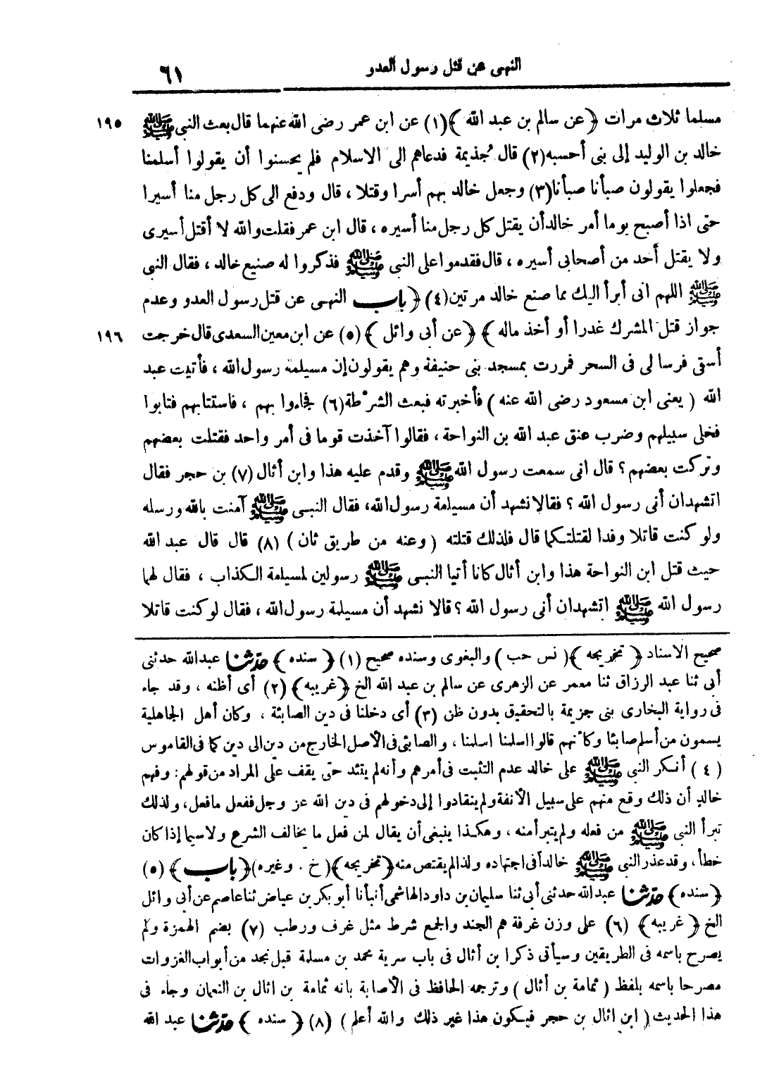 مسلما ثلاث مرات (عن سالم بن عبد الله) عن ابن عمر رضي الله عنهما قال بعث النبي صلى الله عليه وسلم خالد ابن الوليد إلى بني أحسبه قال جذيمة فدعاهم إلى الإسلام فلم يحسنوا أن يقولوا أسلمنا فجعلوا يقولون صبأنا وجعل خالد بهم أسرا وقتلا، قال ودفع إلى كل رجل منا أسيرا حتى إذا أصبح يوما أمر خالد أن يقتل كل رجل منا أسيره، قال ابن عمر فقلت والله لا أقتل أسيري ولا يقتل أحد من أصحابي أسيره، قال فقدموا على النبي صلى الله عليه وسلم فذكروا له صنيع خالد، فقال النبي صلى الله عليه وسلم اللهم إني أبرأ إليك مما صنع خالد مرتين (باب النهي عن قتل رسول العدو وعدم جواز قتل المشرك غدرا أو أخذ ماله) (عن أبي وائل) عن ابن معين السعدي قال خرجت أسقي فرسا في السحر فمررت بمسجد بني حنيفة وهم يقولون إن مسيلمة رسول الله، فأتيت عبد الله (يعني ابن مسعود رضي الله عنه) فأخبرته فبعث الشرطة فجاءوا بهم، فاستتابهم فتابوا فخلى سبيلهم وضرب عنق عبد الله بن النواحة، فقالوا آخذت قوما في أمر واحد فقتلت بعضهم وتركت بعضهم؟ قال أني سمعت رسول الله صلى الله عليه وسلم وقدم عليه هذا وابن أثال بن حجر فقال أتشهد أني رسول الله؟ فقالا نشهد أن مسيلمة رسول الله، فقال النبي صلى الله عليه وسلم آمنت بالله ورسوله ولو كنت قاتلا وفدا لقتلتكما قال فلذلك قتله (وعنه من طريق ثان) قال: قال عبد الله حيث قتل ابن النواحة هذا وابن أثال كانا أتيا النبي صلى الله عليه وسلم رسولين لمسيلمة الكذاب، فقال لهما رسول الله صلى الله عليه وسلم أتشهدان أني رسول الله؟ قالا نشهد أن مسيلمة رسول الله، فقال لو كنت قاتلا