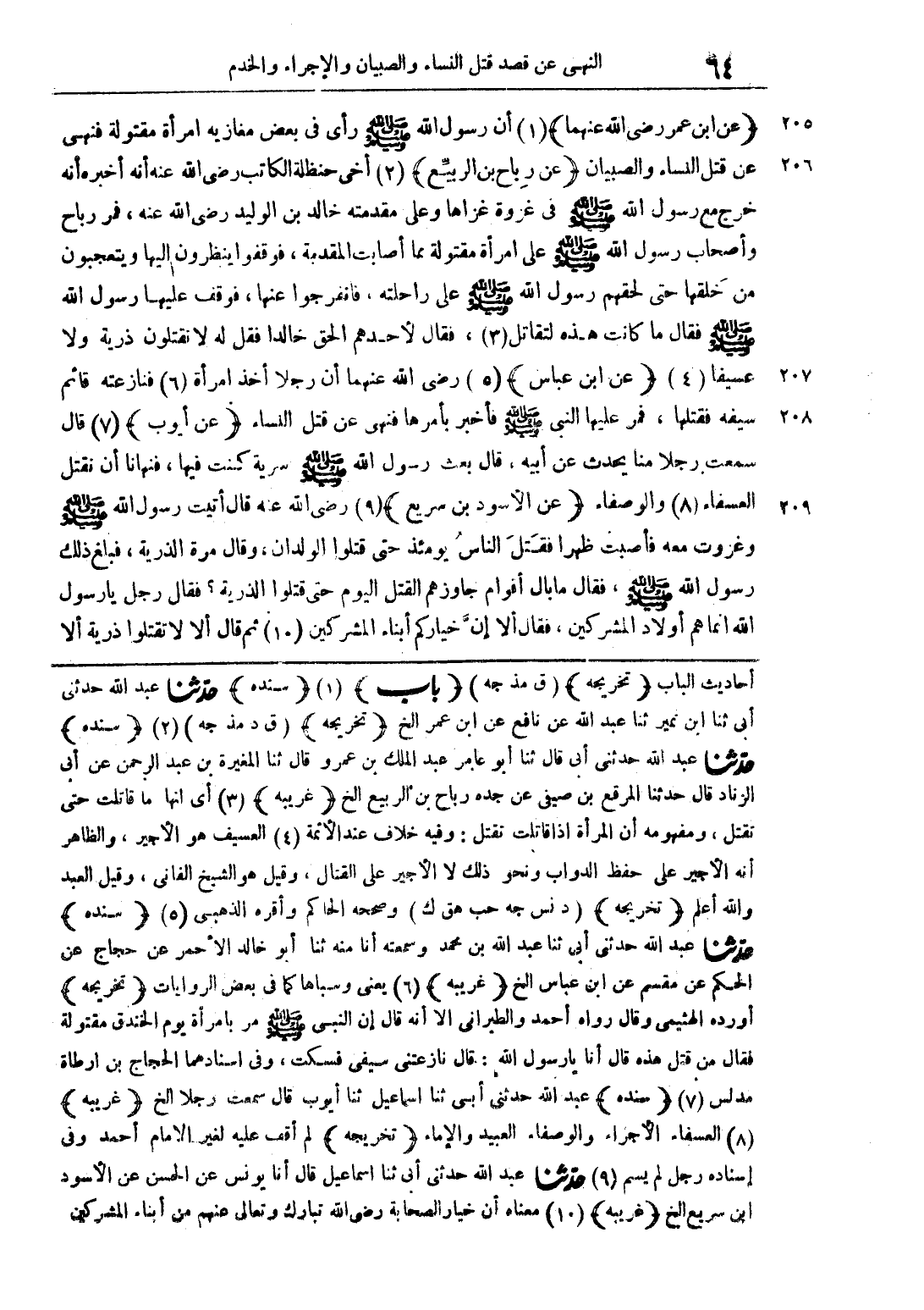 أحاديث الباب (تخريجه) (ق مذ جه) (باب) (سنده) حدثنا عبد الله حدثني أبي ثنا ابن نمير ثنا عبد الله عن نافع عن ابن عمر الخ (تخريجه) (ق د مذ جه) (سنده) حدثنا عبد الله حدثني أبي قال ثنا أبو عامر عبد الملك بن عمرو قال ثنا المغيرة بن عبد الرحمن عن أبي الزناد قال حدثنا المرقع بن صيفي عن جده رباح بن الربيع الخ (غريبة) أي أنها ما قاتلت حتى تقتل، ومفهومه أن المرأة إذا قاتلت تقتل: وفيه خلاف عند الأئمة العسيف هو الأجير، والظاهر أنه الأجير على حفظ الدواب ونحو ذلك لا الأجير على القتال، وقيل هو الشيخ الفاني، وقيل العبد والله أعلم (تخريجه) (د نس جه حب هق ك) وصححه الحاكم وأقره الذهبي (سنده) حدثنا عبد الله أبي ثنا عبد الله بن محمد وسمعته أنا منه أبو خالد الأحمر عن حجاج عن الحكم عن مقسم عن ابن عباس الخ (غريبة) يعني وسباها كما في بعض الروايات (تخريجه) أورده الهيثمي وقال رواه أحمد والطبراني إلا أنه قال النبي صلى الله عليه وسلم مر بامرأة يوم الخندق مقتولة فقال من قتل هذه قال أنا يا رسول الله: قال نازعتني سيفي فسكت، وفي إسنادهما الحجاج بن ارطاة مدلس (سنده) عبد الله حدثني أبي ثنا إسماعيل ثنا أيوب قال سمعت رجلا الخ (غريبة) العسفاء الأجراء والو صفاء العبيد والإماء (تخريجه) لم أقف عليه لغير الإمام أحمد وفي إسناده رجل لم يسمى حدثنا عبد الله حدثني أبي ثنا إسماعيل قال أنا يونس عن الحسن عن الأسود ابن سريع الخ (غريبة) معناه أن خيار الصحابة رضي الله تبارك وتعالى عنهم من أبناء المشركين