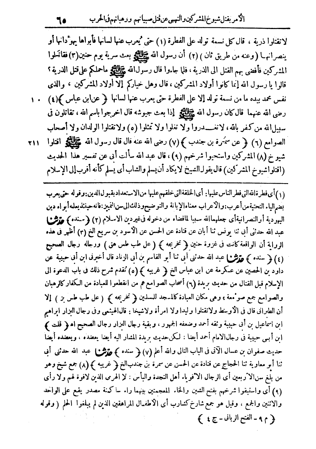 أي فطرة الله التي فطر الناس عليها: أي الخلقة التي خلقهم عليها من الاستعداد بقبول الدين: وقوله حتى يعرب بضم الياء التحتية من أعرب: والأعراب معناه الإبانة والتوضيح وذلك إلى سن التمييز: فإنه حينئذ يعلمه أبواه دين اليهودية أو النصرانية أي جعلهما الله سببا لما قضاه من دخوله في غير دين الإسلام (سنده) حدثنا عبد الله حدثني أبي يونس ثنا أبان عن قتادة عن الحسن عن الأسود بن سريع الخ أظهر في هذه الرواية أن الواقعة كانت في غزوة حنين (تخريجه) (عل طب طس هق) ورجاله رجال الصحيح (سند) حدثنا عبد الله حدثني أبي ثنا أبو القاسم بن أبي الزناد قال أخبرني ابن أبي حبيبة عن داود بن الحصين عن عكرمة عن ابن عباس الخ (غريبة) تقدم الشكر ذلك في باب الدعوة إلى الإسلام قبل القتل من حديث بريدة أصحاب الصوامع هم من انقطعوا للعبادة من الكفار كالرهبان والصوامع جمع صومعة، وهي مكان العبادة كالمسجد للمسلمين (تخريجه) (عل طب طس بز) إلا أن الطبراني قال في الأوسط ولا تفتلوا وليدا ولا امرأة ولا شيخا: قال الهيثمي وفي رجال البزار إبراهيم ابن إسماعيل بن أبي حبيبة وثقه أحمد وضعفه الجمهور، وبقية رجال البزار رجال الصحيح اهـ (قلت) ابن أبي حبيبة في رجال الإمام أحمد أيضا: لكن حديث بريدة المشار إليه أيضا يعضده، ويعضده أيضا حديث صفوان بن عسال الآتي في الباب التالي والله أعلم (سنده) حدثنا عبد الله حدثني أبي ثنا معاوية ثنا الحجاج عن قتادة عن الحسن عن سمرة بن جندب الخ (غريبة) جمع شيخ وهرم من بلغ سن الأربعين أي رجال الأقوياء أهل النجدة والبأس: لا الهرمى الذين لا قوة ولا رأى أي واستبقوا شرخهم بفتح الشين والخاء المعجمتين بينهما راء ساكنة مصدر يقع على الواحد والاثنين والجمع، وقيل هو جمع شارخ كشارب أي الأطفال المراهقين الذين لم يبلغوا الحلم (وقوله