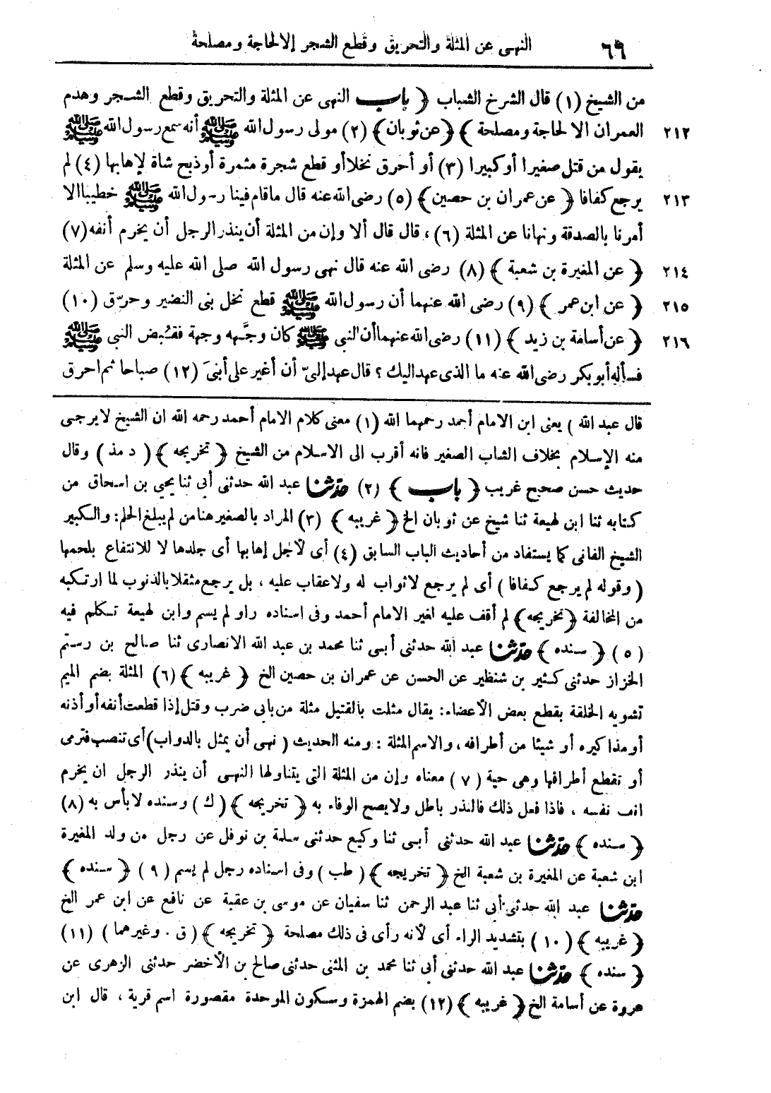 قال عبد الله) يعني ابن الإمام أحمد رحمهما الله معنى كلام الإمام أحمد رحمه الله أن الشيخ لا يرجى منه الإسلام بخلاف الشاب الصغير فإنه أقرب إلى الإسلام من الشيخ (تخريجه) (د مذ) حديث حسن صحيح غريب (باب) حدثنا عبد الله حدثني أبي ثنا يحيى بن إسحاق من كتابة ثنا ابن لهيعة ثنا شيخ عن ثوبان الخ (غريبة) المراد بالصغير هنا من لم يبلغ الحلم: والكبير الشيخ الفاني كما يستفاد من أحاديث الباب السابق أي لأجل أهابها أي جلدها لا للانتفاع بلحمها (وقوله لم يسترجع كفاف) أي لم يرجع لا ثواب له ولا عقاب عليه، بل يرجع مثقلا بالذنوب لما ارتكبه من المخالفة (تخريجه) لم أقف عليه لغير الإمام أحمد وفي سنده راو لم يسم وابن لهيعة تكلم فيه (سنده) حدثنا عبد الله حدثني أبي ثنا محمد ابن عبد الله الأنصاري ثنا صالح بن رستم الخزاز حدثني كثير بن شنظير عن الحسن عن عمران بن حصين الخ (غريبة) المثلة بضم الميم تشويه الخلقة بقطع بعض الأعضاء: يقال مثلت بالقتيل مثله من بابي ضرب وقتل إذا قطعت أنفه أو أذنه أو مذاكيره أو شيئا من أطرافه، والاسم المثلة: ومنه الحديث (نهي أن يمثل بالدواب) أي تنصب فترمي أو تقطع أطرافها وهي حية معناه وإن من المثلة التي يتناولها النهي أن ينذر الرجل أن يخرم أنف نفسه، فإذا فعل ذلك فالنذر باطل ولا يصح الوفاء به (تخريجه) (ك) وسنده لا بأس به (سنده) حدثنا عبد الله حدثني أبي ثنا وكيع حدثني سلمة بن نوفل عن رجل من ولد المغيرة ابن شعبة الخ (تخريجه) (طب) وفي إسناده رجل لم يسم (سنده) حدثنا عبد الله حدثني أبي ثنا عبد الرحمن ثنا سفيان عن موسى بن عقبة عن نافع عن ابن عمر الخ (غربية) بتشديد الراء أي لأنه رأى في ذلك مصلحة (تخريجه) (ق. وغيرهما) (سنده) حدثنا عبد الله حدثني أبي ثنا محمد بن المثنى حدثني صالح بن الأخضر حدثني الزهري عن عروة عن أسامة الخ (غريبة) بضم الهمزة وسكون الموحدة مقصورة اسم قرية، قال ابن
