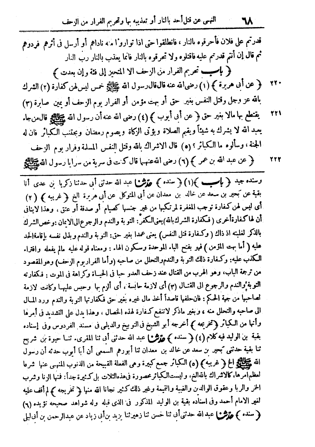 (عن أبي هريرة) رضي الله عنه قال: قال رسول الله صلى الله عليه وسلم خمس ليس لهن كفارة الشرك بالله عز وجل وقتل النفس بغير حق بهت نؤمن أن الفرار يوم الزحف أو يمين صابرة يقتطع بها ما لا بغير حق (عن أيوب) رضي الله عنه أن رسول الله صلى الله عليه وسلم قال من جاء يعبد الله لا يشرك به شيئا ويقيم الصلاة ويأتي الزكاة ويصوم رمضان ويجتنب الكبائر فإن له الجنة، وسألوه ما الكبائر؟ قال الاشرك بالله وقتل النفس المسلمة وفرار يوم الزحف (عن عبد الله بن عمر) رضي الله عنهما قال كنت في سرية من سرايا رسول الله صلى الله عليه وسلم