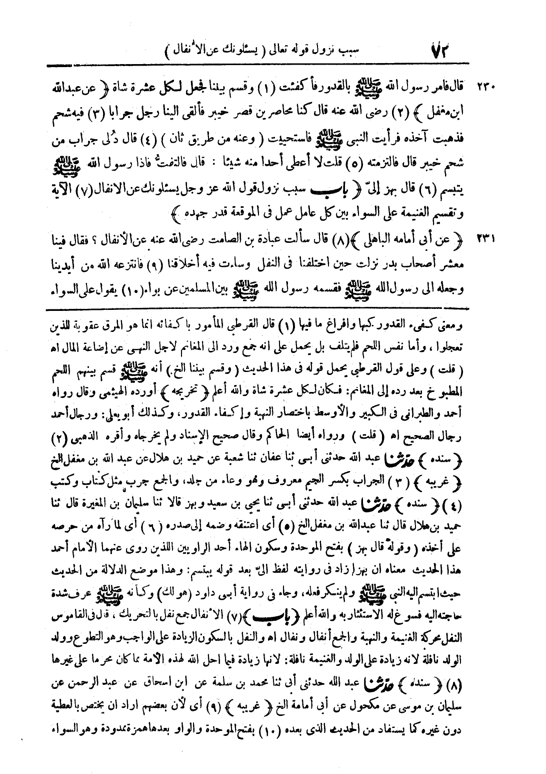ومعنى كفئ القدور كبها وافرغ ما فيها قال القرطبي المأمور بأكفائه إنما هو المرق عقوبة الذين تعجلوا، وأما نفس اللحم فلم يتلف بل يحمل على أنه جمع ورد إلى المغانم لأجل النهي عن إضاعة المال اهـ (قلت) وعلى قول القرطبي يحمل قوله في هذا الحديث (وقسم بيننا الخ) أنه صلى الله عليه وسلم قسم بينهم اللحم المطبوخ بعد رده إلى المغانم: فكان لكل عشرة شاة والله أعلم (تخريجه) أورده الهيثمي وقال رواه أحمد والطبراني في الكبير والأوسط باختصار النهبة وإكفاء القدور، وكذلك أبو يعلى: ورجال أحمد رجال الصحيح (قلت) ورواه أيضا الحاكم وقال صحيح الإسناد ولم يخرجاه وأقره الذهبي (سنده) حثنا عبد الله حدثني أبي ثنا عفان ثنا شعبة عن حميد بن هلال عن عبد الله بن مغفل الخ (غريبة) الجراب بكسر الجيم معروف وهو وعاء من جلد، والجمع جرب مثل كتاب وكتب (سنده) حدثنا عبد الله حدثني أبي يحيى بن سعيد وبهز قالا ثنا سليمان بن المغيرة قال ثنا حميد بن هلال قال ثنا عبد الله بن مغفل الخ أي اعتنقه وضمه إلى صدره أي لما رآه من حرصه على أخذه (وقوله قال بهز) بفتح الموحدة وسكون الهاء أحد الراوين اللذين روى عنهما الامام أحمد هذا الحديث معناه أن بهزازاد في رواته لفظ إلى بعد قوله يبتسم: وهذا موضع الدلالة من الحديث حيث إبتسم إليه النبي صلى الله عليه وسلم ولم ينكر فعله، وجاء في رواية أبي داود (هو لك) وكأنه صلى الله عليه وسلم عرف شدة حاجته إليه فسوغ له الاستئثار به والله أعلم (باب) الأنفال جمع نفل بالتحريك، قال في القاموس النفل محركة الغنيمة والنهبة والجمع أنفال ونفال اهـ والنفل بالسكون الزيادة على الواجب وهو التطوع وولد الولد نافلة لأنه زيادة على الولد والغنيمة نافلة: لأنها زيادة فيما أحل الله لهذه الأمة مما كان محرما على غيرها (سنده) حدثنا عبد الله حدثني أبي ثنا محمد بن سلمة عن ابن إسحاق عن عبد الرحمن عن سليمان بن موسى عن مكحول عن أبي أمامة الخ (غريبة) أي لأن بعضهم أراد أن يختص بالعطية دون غيره كما يستفاد من حديث الذي بعده بفتح الموحدة والواو بعدها همزة ممدودة وهو السواء