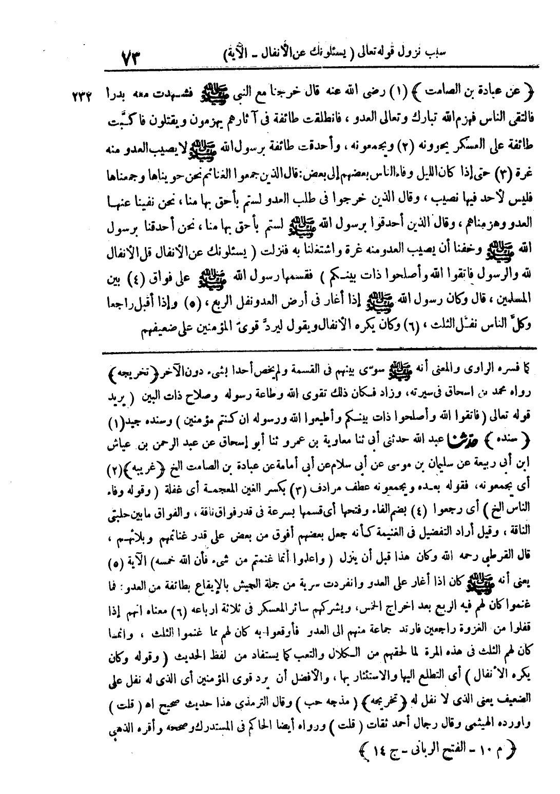 (عن عبادة بن الصامت) رضي الله عنه قال خرجنا مع النبي صلى الله عليه وسلم فشهدت معه بدرا فالتقى الناس فهزم الله تبارك وتعالى العدو، فانطلقت طائفة في آثارهم يهزمون ويقتلون فأكبت طائفة على العسكر يحوونه ويجمعونه، وأحدقت طائفة برسول الله صلى الله عليه وسلم لا يصيب العدو منه غرة حتى إذا كان الليل وفاء الناس بعضهم إلى بعض: قال الذين جمعوا الغنائم نحن حويناها وجمعناها فليس لأحد فيها نصيب، وقال الذين خرجوا في طلب العدو لستم بأحق بها منا، نحن نفينا عنها العدو وهزمناهم، وقال الذين أحدقوا برسول الله صلى الله عليه وسلم لستم بأحق بها منا، نحن أحدقنا برسول الله صلى الله عليه وسلم وخفنا أن يصيب العدو منه غرة واشتغلنا به فنزلت (يسألونك عن الأنفال قل الأنفال لله والرسول فاتقوا الله وأصلحوا ذات بينكم) فقسمها رسول الله صلى الله عليه وسلم على فواق بين المسلمين، قال وكان رسول الله صلى الله عليه وسلم إذا أغار في أرض العدو نفل الربع، وإذا أقبل راجعا وكل الناس نفل الثلث، وكان يكره الأنفال ويقول ليرد قوى المؤمنين على ضعيفهم